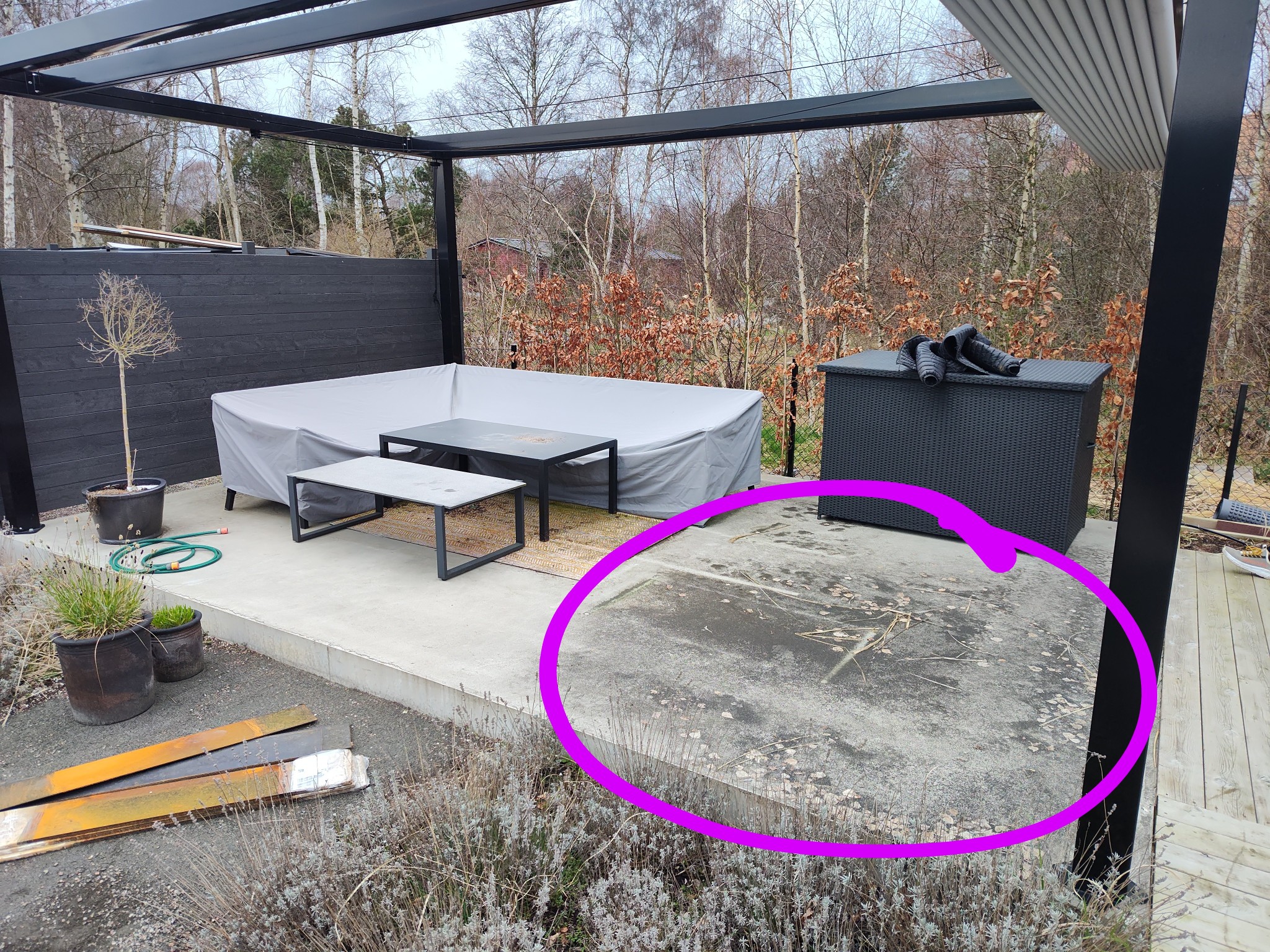 Vi har en platta egentligen tänkt att använda till uterum men av olika orsaker kunde vi till slut inte göra det och fick göra en pergola på den platsen istället. Plattan gjöts vågrät men säg den ytan som är perfekt... Det ansamlas ett tunnt lager vatten på en yta och det rinner inte av. Någon idé vad man kan göra för att bli av med vattnet? Det enda jag kan tänka på är att be någon flyta en lutning men jag vet inte om det blir bra. Det rör sig om 24 kvm.