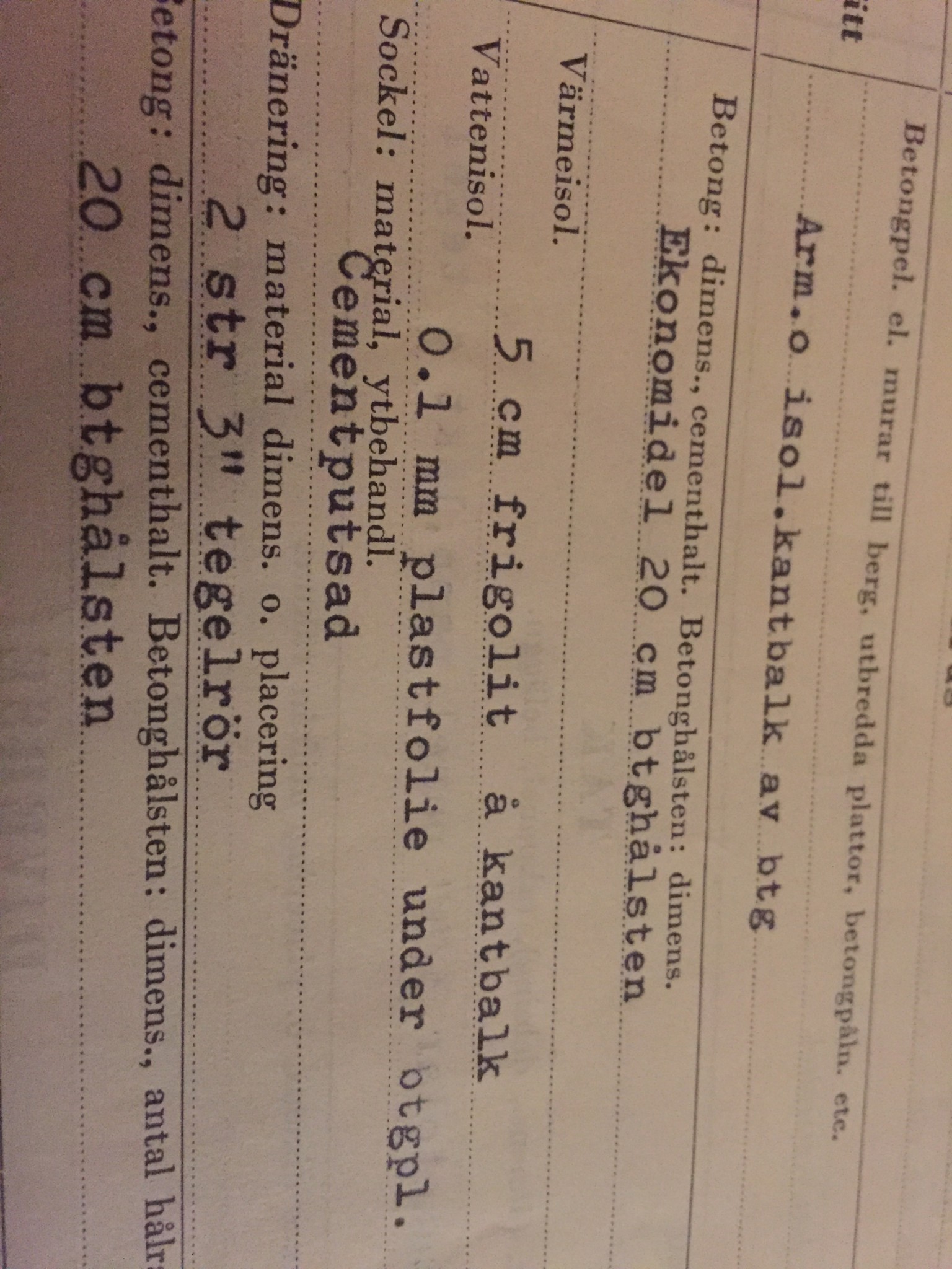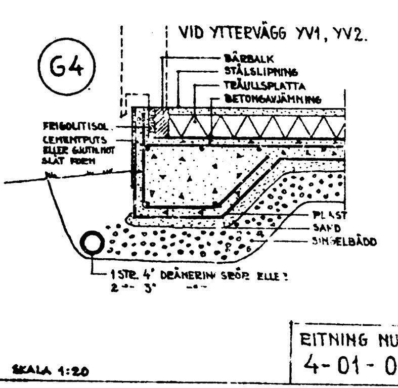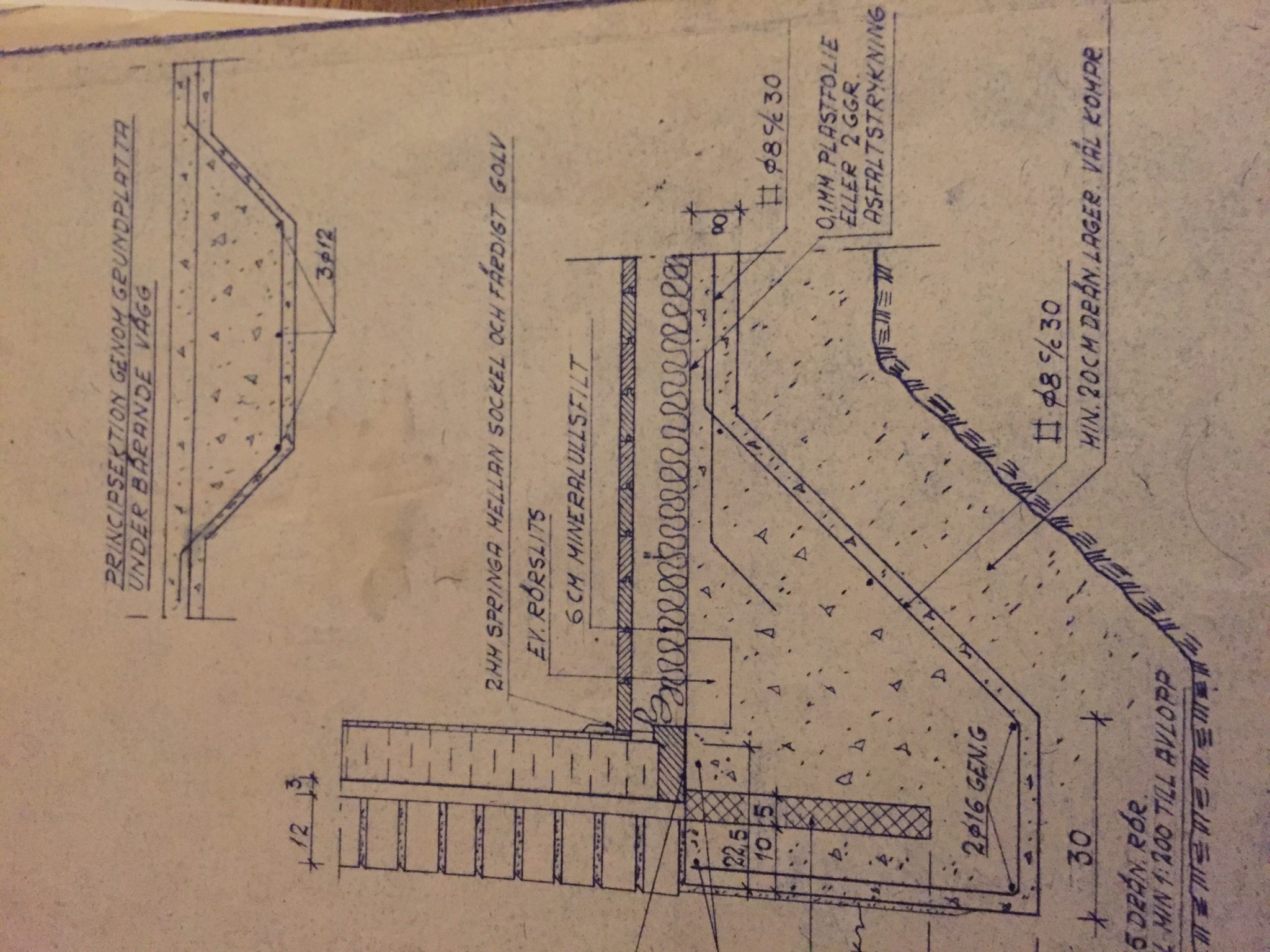 Jag har nu tittat på konstruktionsritningen från bygglovet och vill väl bara kolla om någon kan tolka den. Såsom jag ser det på ritningen så verkar det ligga plast under betongen. Skalan är 1:20 och på originalpappret så är plasten 4mm = 8cm i verkligheten. Eller är det bara en liten plastfolie som ligger ovanpå sanden?