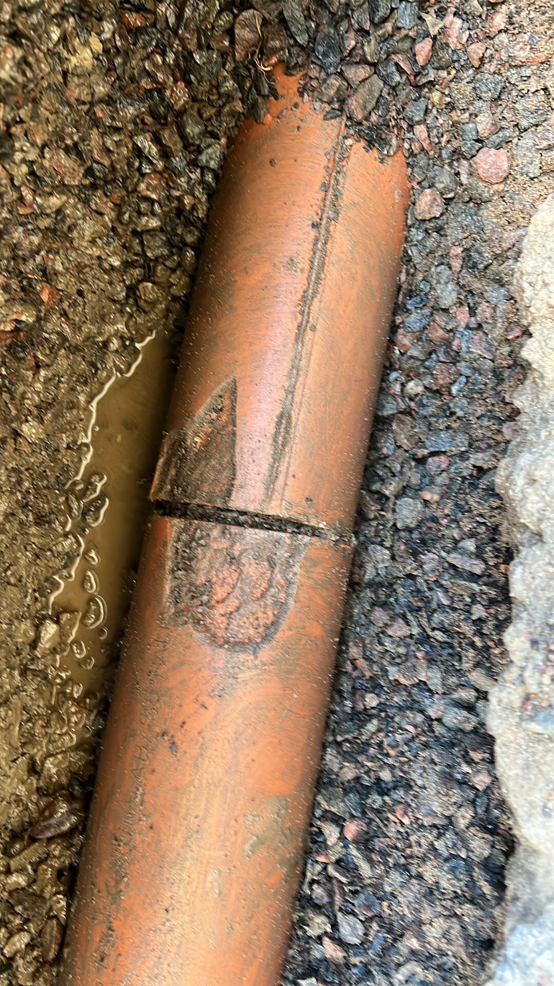 Så jag grävde upp och i skarven ungefär där det hade sjunkt så glipade det och det va skador på röret (antagligen sättningar som fått röret att flytta på sig och det bli lite extra vatten som trycks ut där)