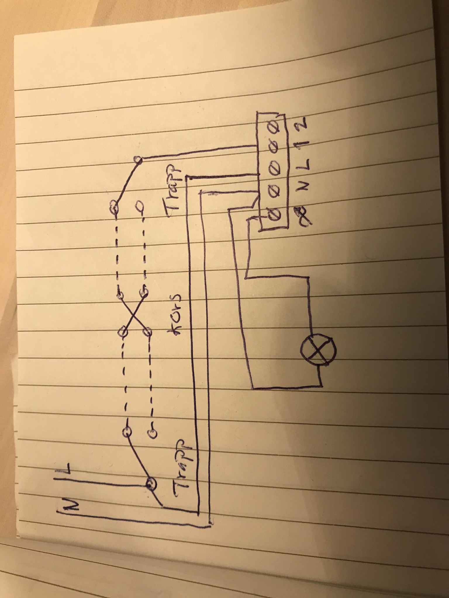 Sorry, jag som örade till det lite när jag trodde korsbrytaren skulle bort.J Behörig Installatör skrev:Byter du till 2st nya trapp och 1 st kors och kopplar likadant samt sätter fjädrar så kan du ansluta Dimmerns brytaringång till tändtråden från trappbrytaren (den trappbrytaren som idag tänder armaturen).