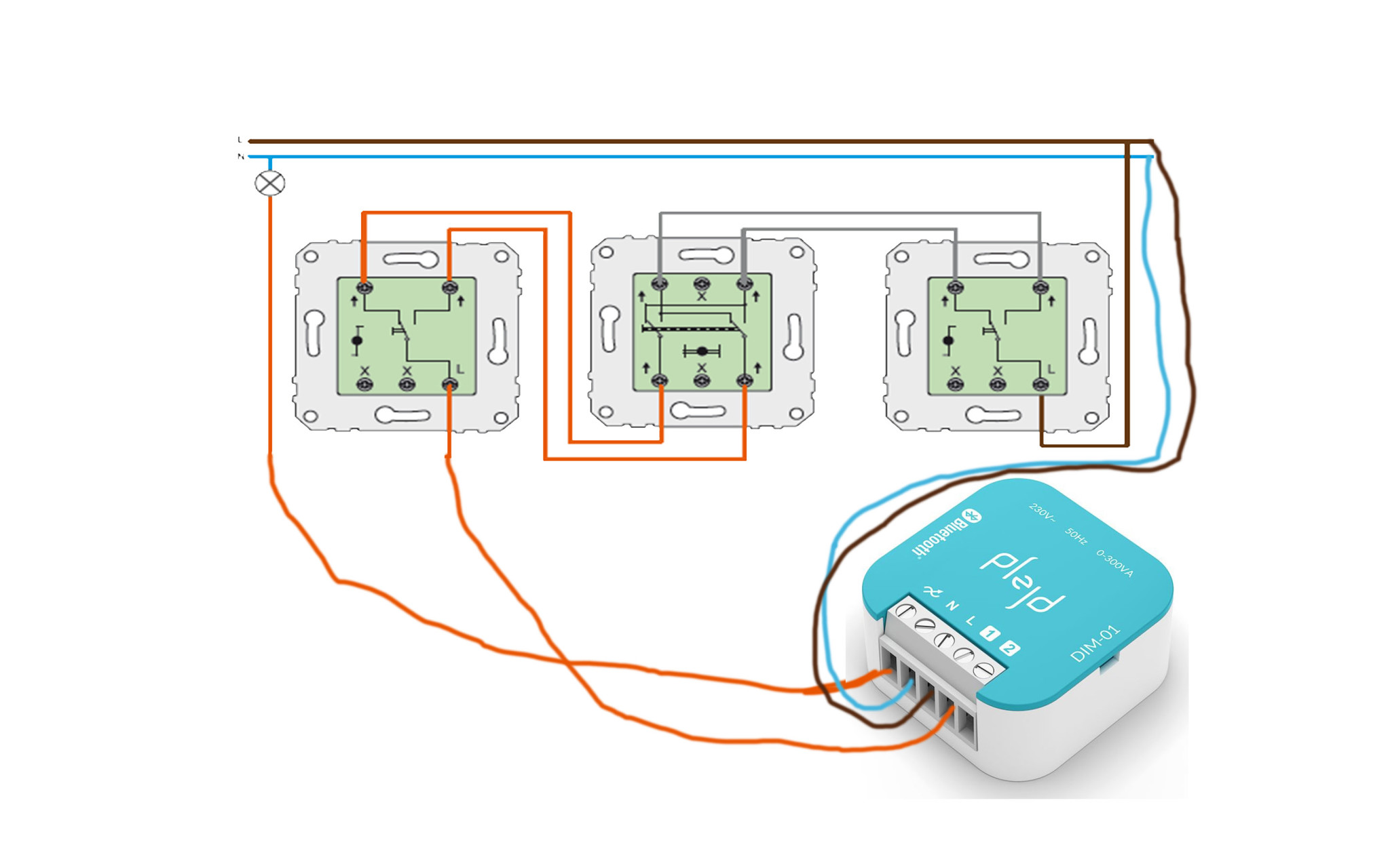 Byter du till 2st nya trapp och 1 st kors och kopplar likadant samt sätter fjädrar så kan du ansluta Dimmerns brytaringång till tändtråden från trappbrytaren (den trappbrytaren som idag tänder armaturen).