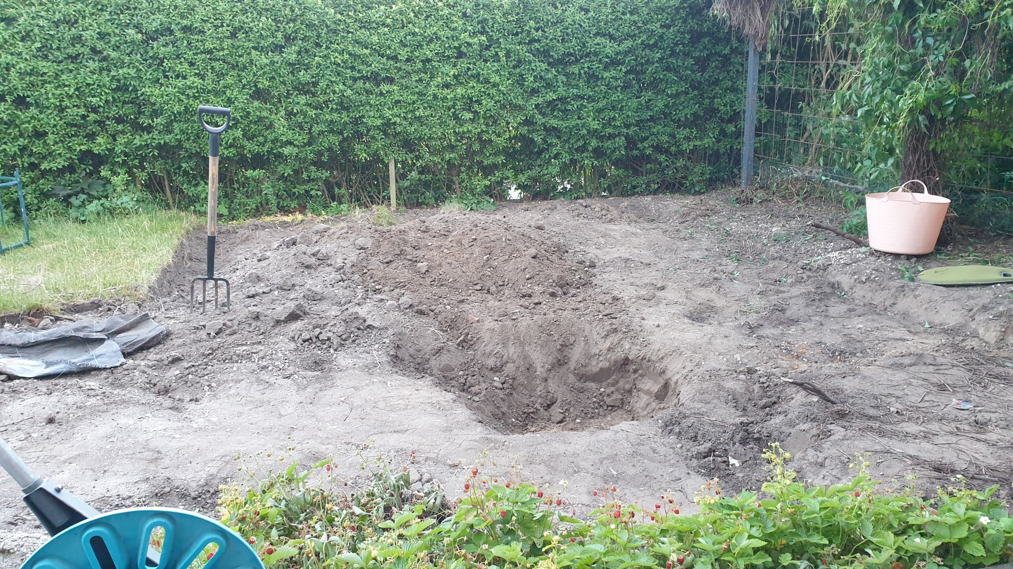 Har en grävare som ska schakta bort överflödig jord, men tanken med handgrävningen var att slippa ta ned häcken och bara sträcka in skopan över den. Nu har vi grävt upp halvvägs och inser att "matjordslagret" verkar gå 50-60cm ned. Kollade av med grävaren som säger att då behöver hela rasket grävas ut och plintar sättas, sedan återfylla jord runt plintarna.