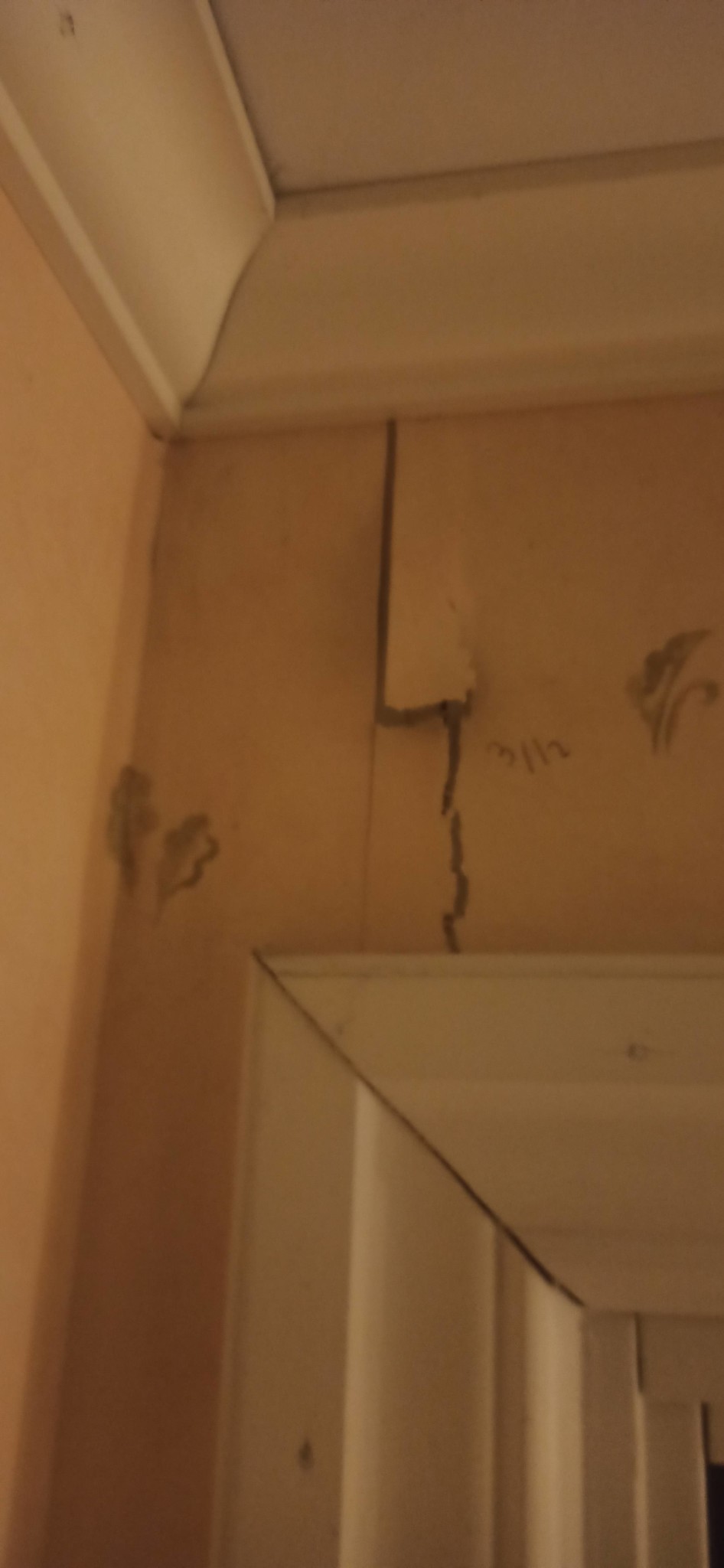 Vi har nyligen köpt ett 1,5 plans- hus byggt 2000. Dessa sprickor har helt uppkommit/växt senaste veckorna. Vad gör man nu? Hur kan man avgöra om en ev. sättning är allvarlig eller normal? Värt att nämna att vi haft en dörr som skärvat något för ett antal månader sen, och att jag noterat att golvet på nedre plan sjunkit ihop något/blivit ojämnt senaste veckorna. Vi har några sprickor längst med husgrunden, i stil med den bild jag bifogat. För kännedom har vi krypgrund.