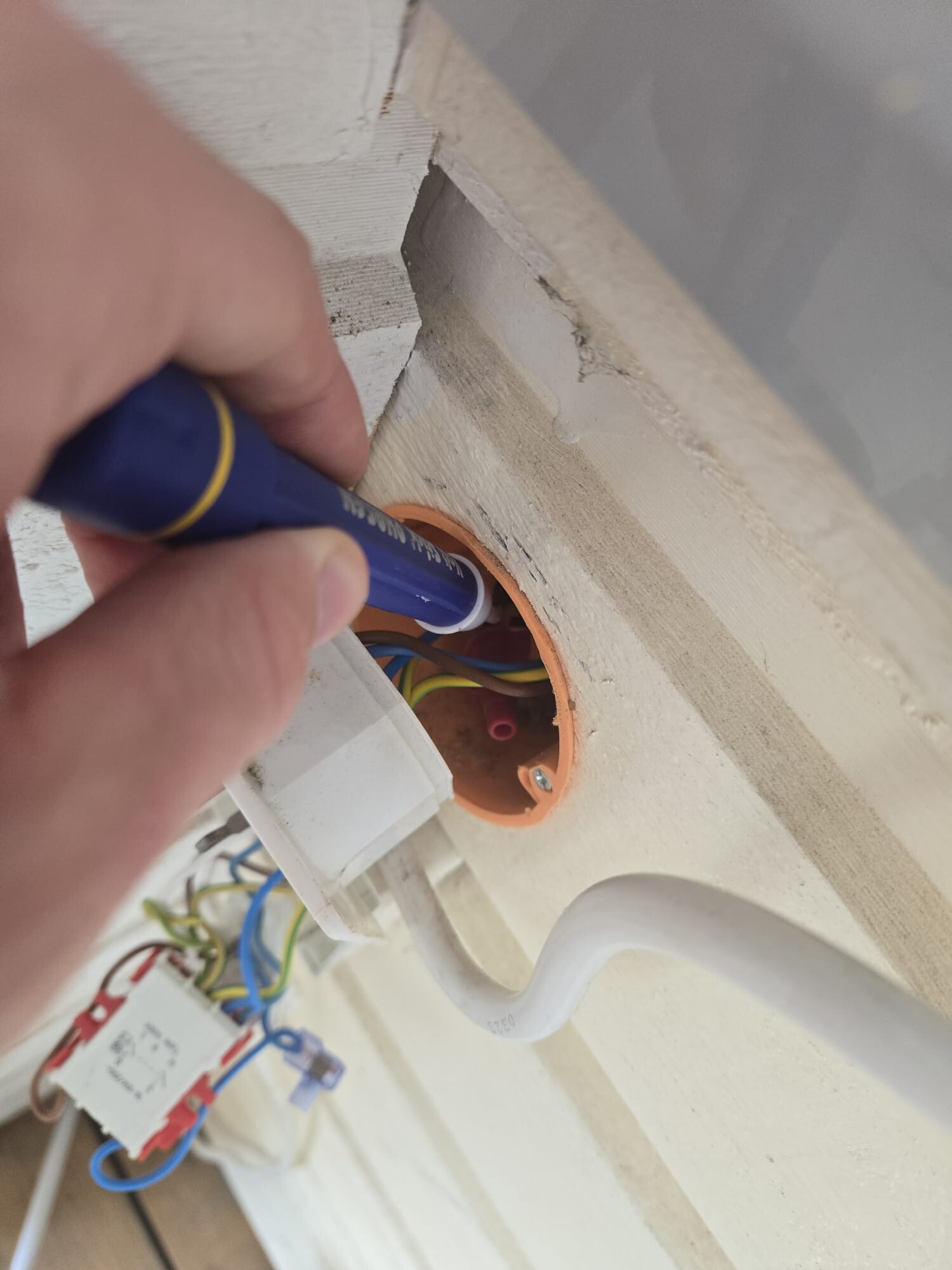 Den dåliga nyheten nu är att jag misstänker att det där inte är regelenligt gjort. Hålet i dosan är såpass litet att jag tror att man bara dragit ledarna ut och sedan in igen i brytaren nedanför utan flexslang. Detta är fel, enkelisolerade ledare får inte ligga så. Det är ett problem som behöver åtgärdas så småningom.