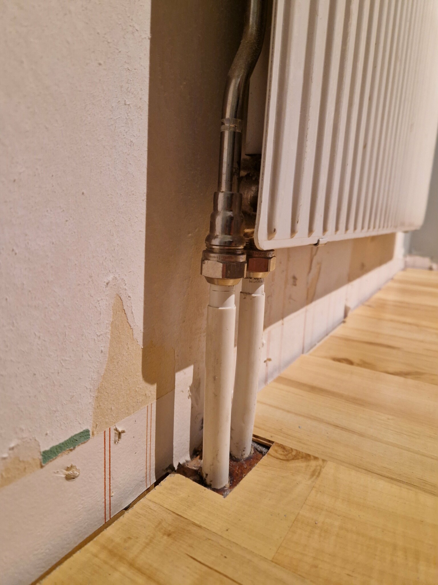 Edit: För demontering av radiator - förhoppningsvis finns det en kran för tömning av systemet någonstans på det lägst belägna röret. Hos oss finns det en pip på kranen där en vanlig trädgårdsslang passar. Bryt el till elpannan. Töm och låt det rinna länge så att så mycket som möjligt rinner ut. Den del av radiatorns konsol som greppar radiatorns överkant är fjäderbelastad och lyfts rakt upp några millimeter så att radiatorns överkant kan vickas utåt 2-3 mm. Låt konsolens överdel vila strax bakom radiatorns övre fläns. Det kan behövas en stor polygrip för att kunna lyfta konsolens överdel om den har kärvat fast efter 40 år (som våra hade). Ladda sedan upp med trasor runt rören som går ner i golvet. Lossa M22*1.5 muttrarna från radiatorns koppel. Placera en hink bredvik kopplet. Lyft radiatorns sida där kopplet sitter först och håll den delen hela tiden högre än motstående sida när radiatorn lyfts bort. Placera över hinken och töm ur förhoppningsvis bara några deciliter vatten som finns kvar i radiatorns nedre del.