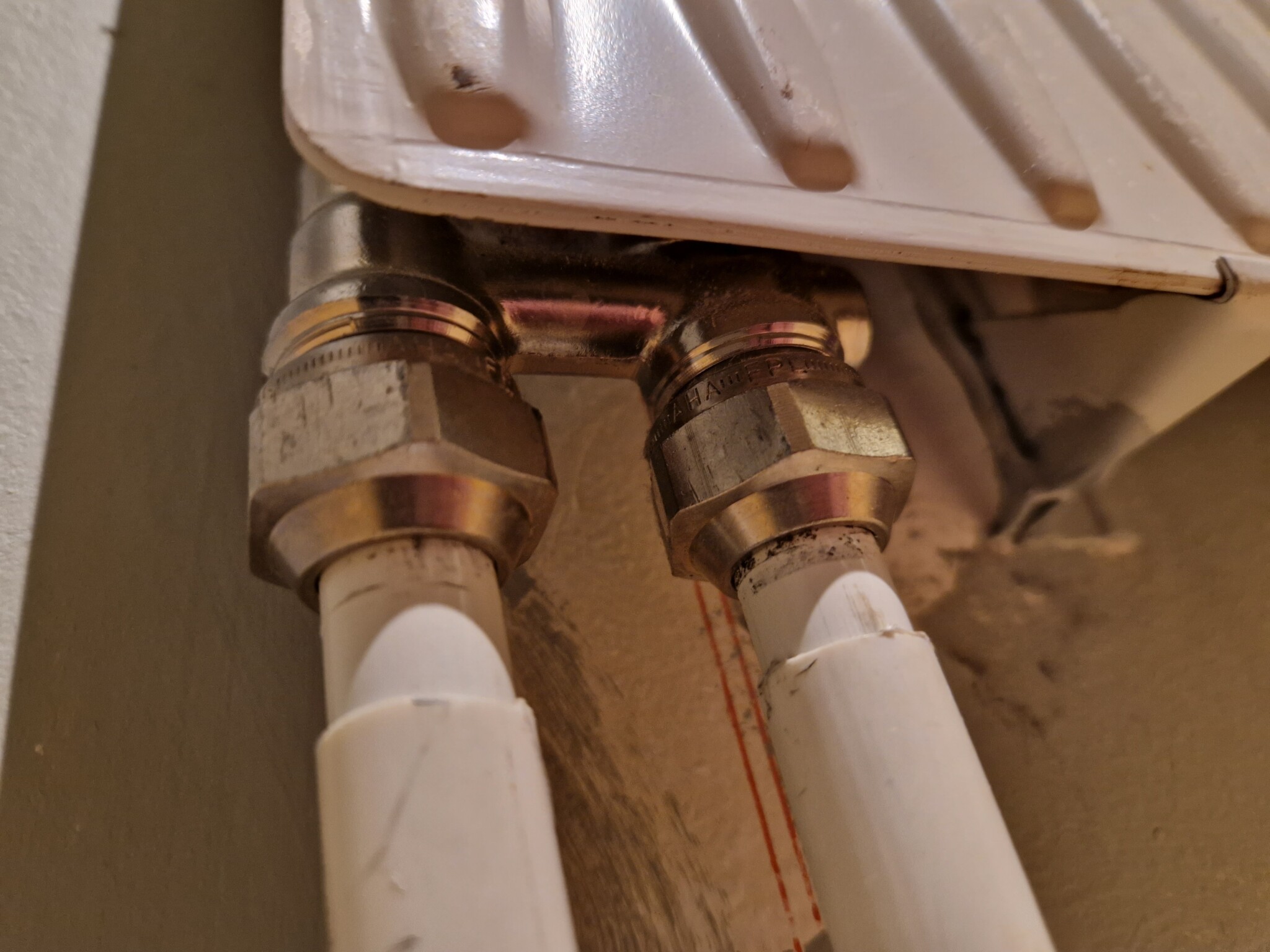 Bifogad bild visar motsvarande radiatoranslutning med 12 mm prisolrör. Skillnaden mellan 12 och 15 mm syns bl a på muttrarna.