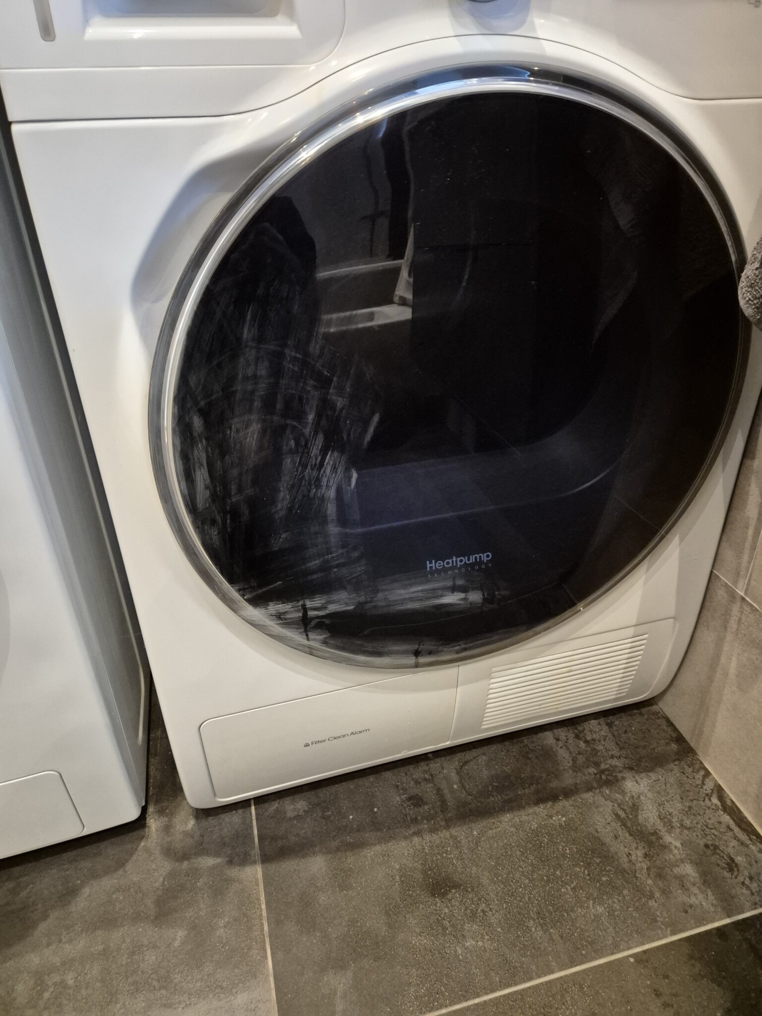 Nagellacksbortagning med ethyl acetate har används på torktumlare lucka för att ta bort nagellack som spilldes. Yttan är nu yttlig skada/vit.
