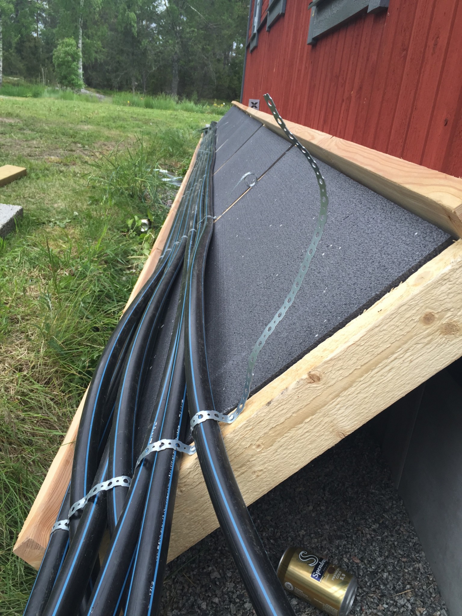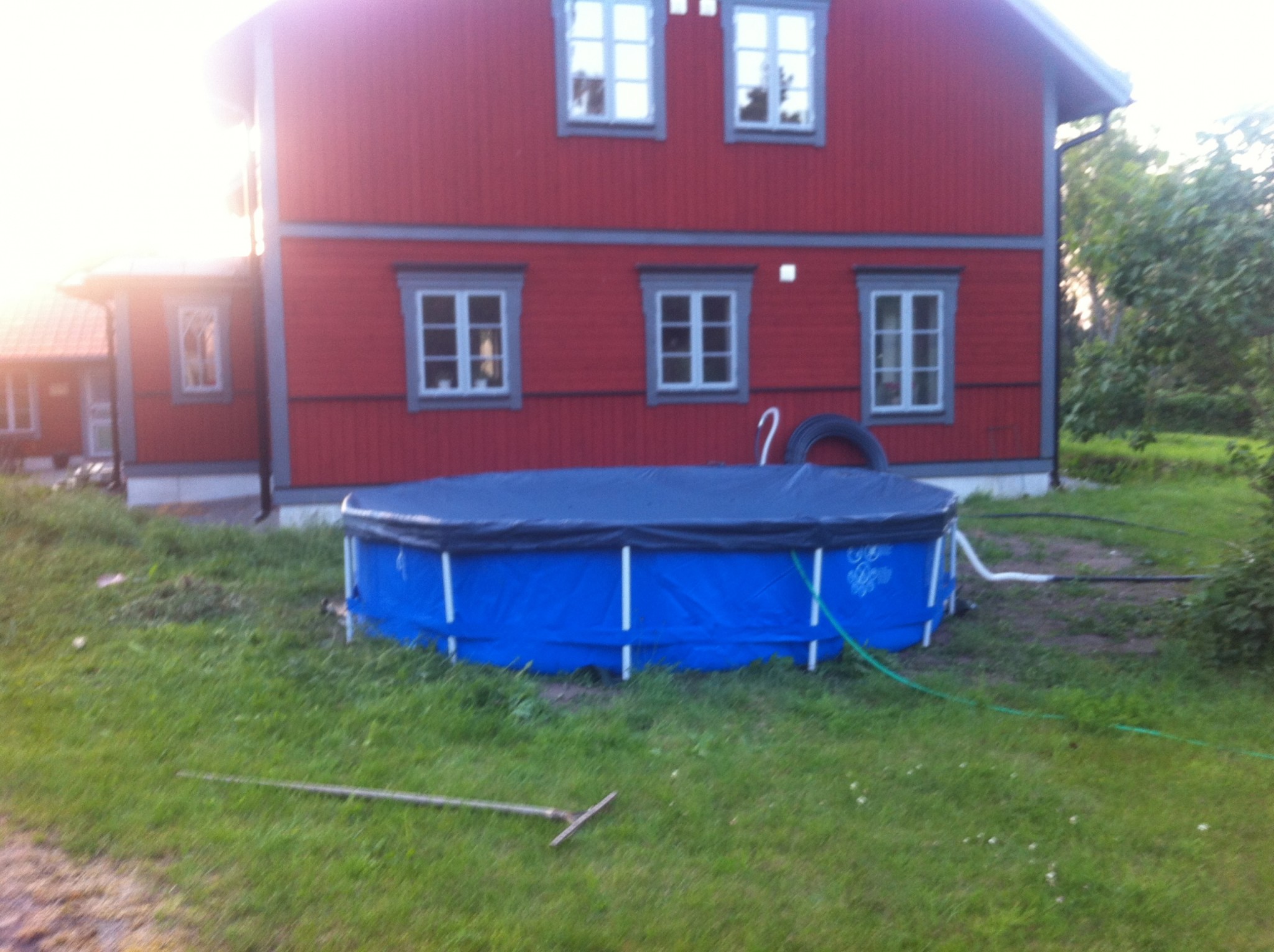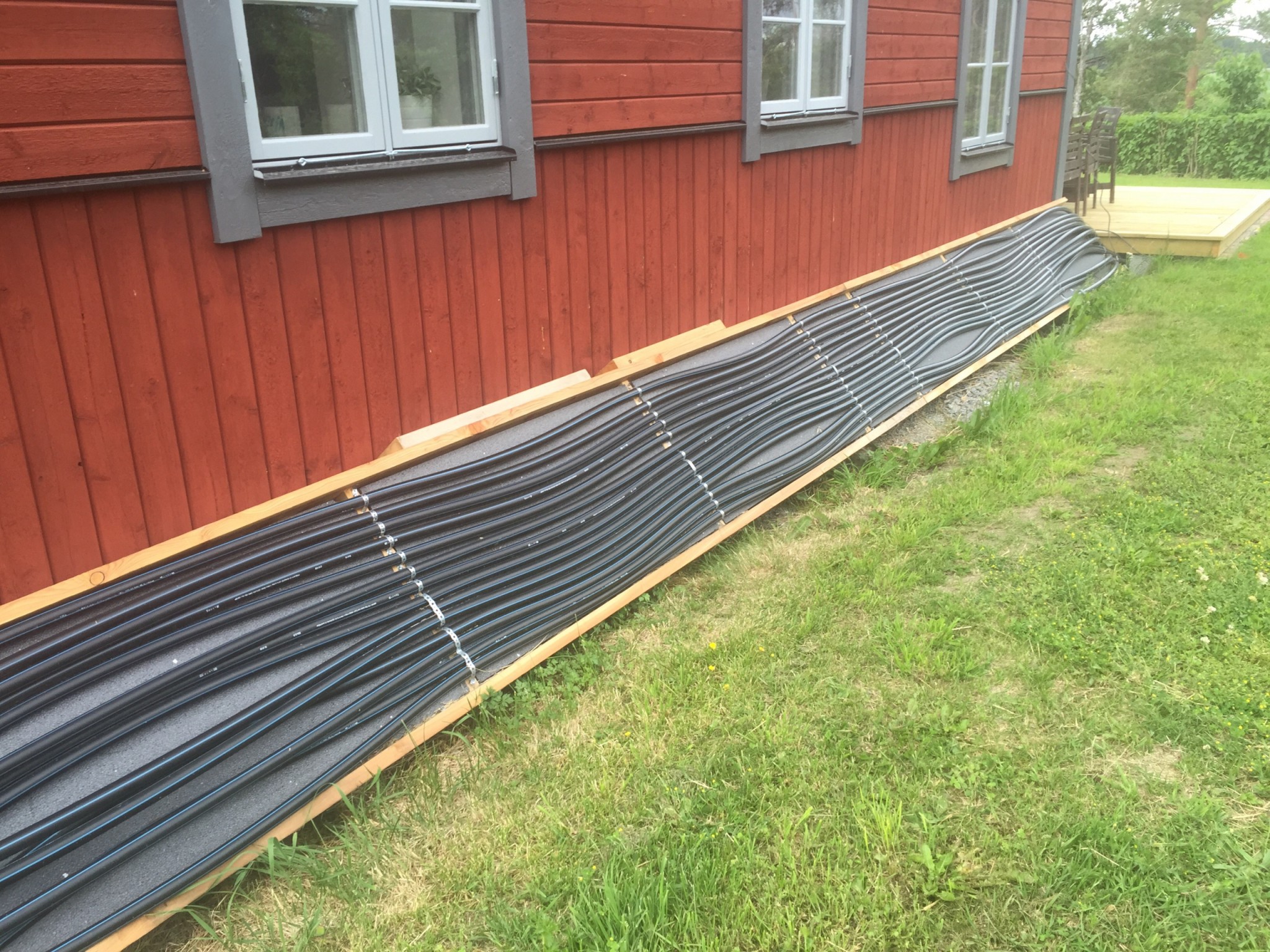 Förra året köpte jag mig en Intex pool som rymmer 5,5m3 vatten (Bara 70cm djup) och för att värma upp poolen köpte jag mig 100m Pem slang som jag ställde lite snabbt mot husväggen och skjuvrade och bara igenom det så fick jag upp poolen till 28-29 grader varma och soliga dagar 23-24 grader i medel (Husväggen är i rakt söderläge), men såg fult ut (se bild nedan) (på bilden är slangrullen dock ej skjuvrad)