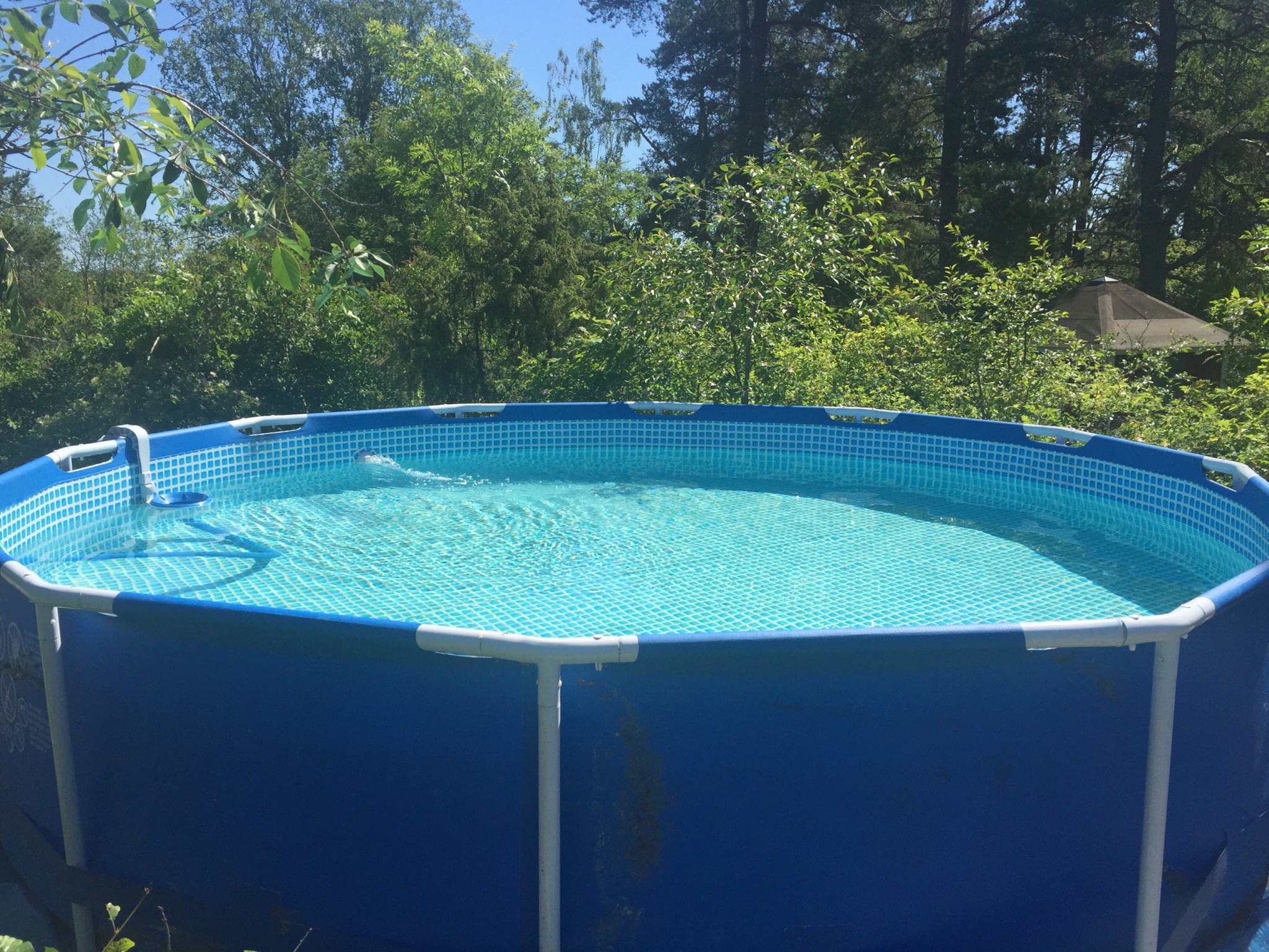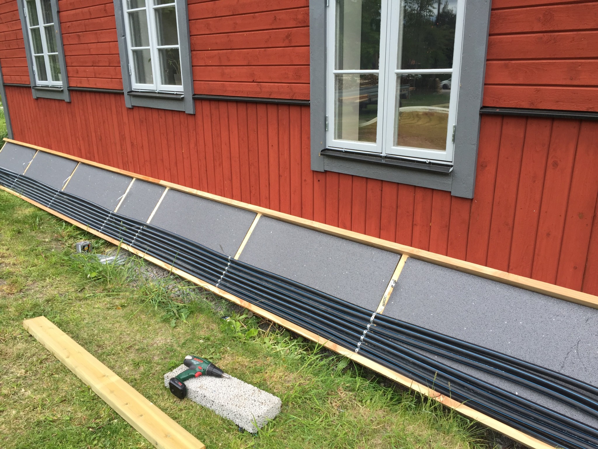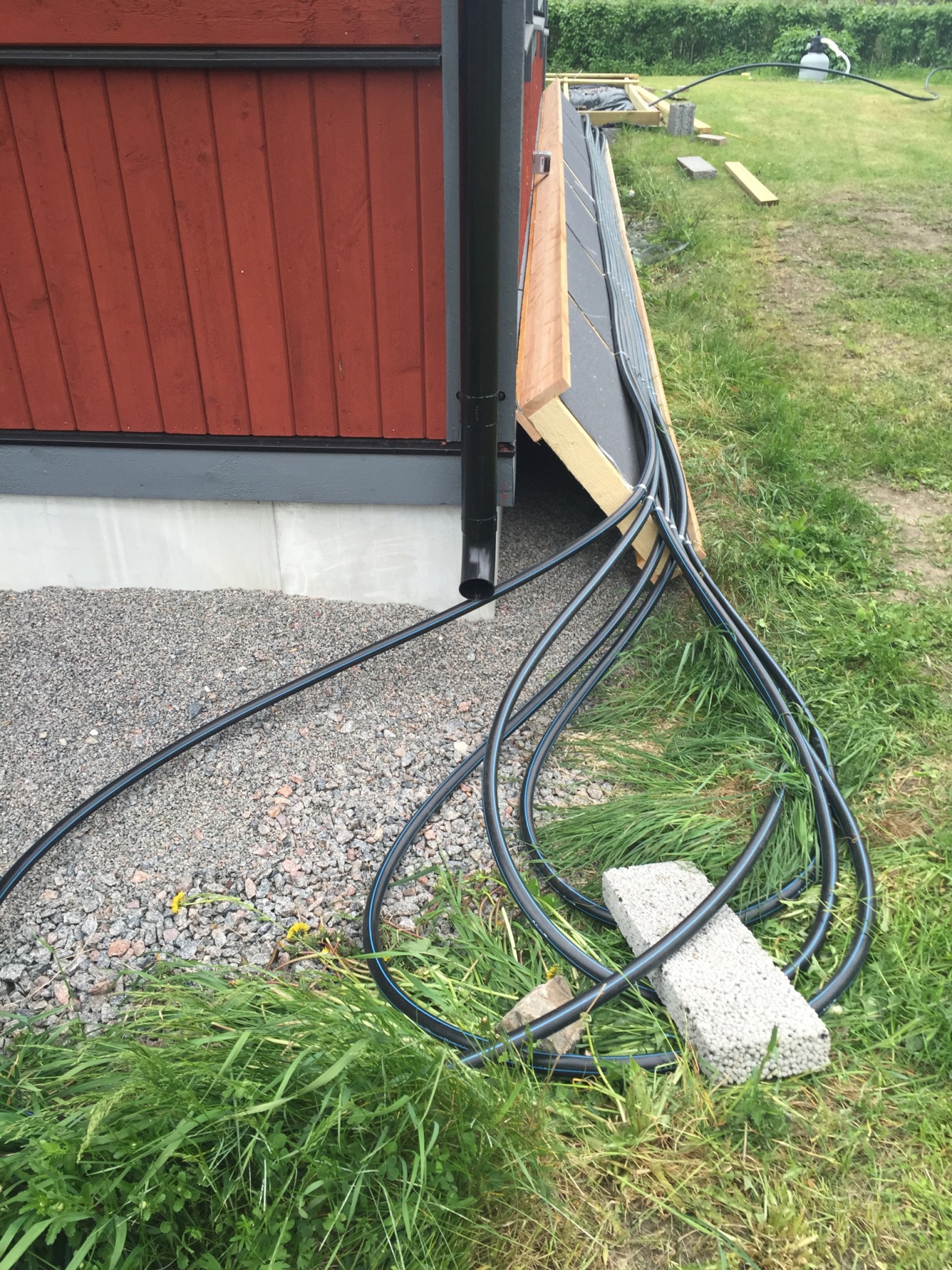 Förra året köpte jag mig en Intex pool som rymmer 5,5m3 vatten (Bara 70cm djup) och för att värma upp poolen köpte jag mig 100m Pem slang som jag ställde lite snabbt mot husväggen och skjuvrade och bara igenom det så fick jag upp poolen till 28-29 grader varma och soliga dagar 23-24 grader i medel (Husväggen är i rakt söderläge), men såg fult ut (se bild nedan) (på bilden är slangrullen dock ej skjuvrad)
