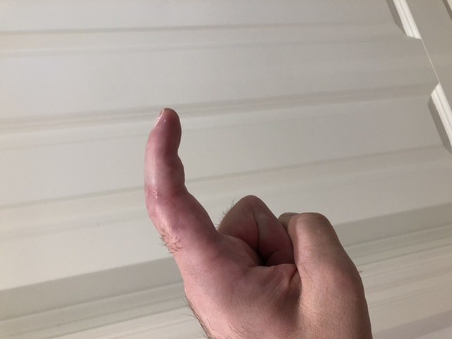 Jag lyckades med en idiotgrej. Jag fastnade med fingret mellan ett träämne och bandslipen och lyckades slipa ett litet hål i nageln så att ett litet sår uppstod. Inte tänkte jag så mycket på det. småsår har man ju överallt. Men satan i gatan vad det kändes efter en stund. Nu en vecka senare börjar det bli bättre. Så fort jag nuddar utsidan av nageln känns som om jag träffar nageln med en hammare i full fart. Jag måste ha kommit djupare än jag trodde och väldigt nära en nerv.