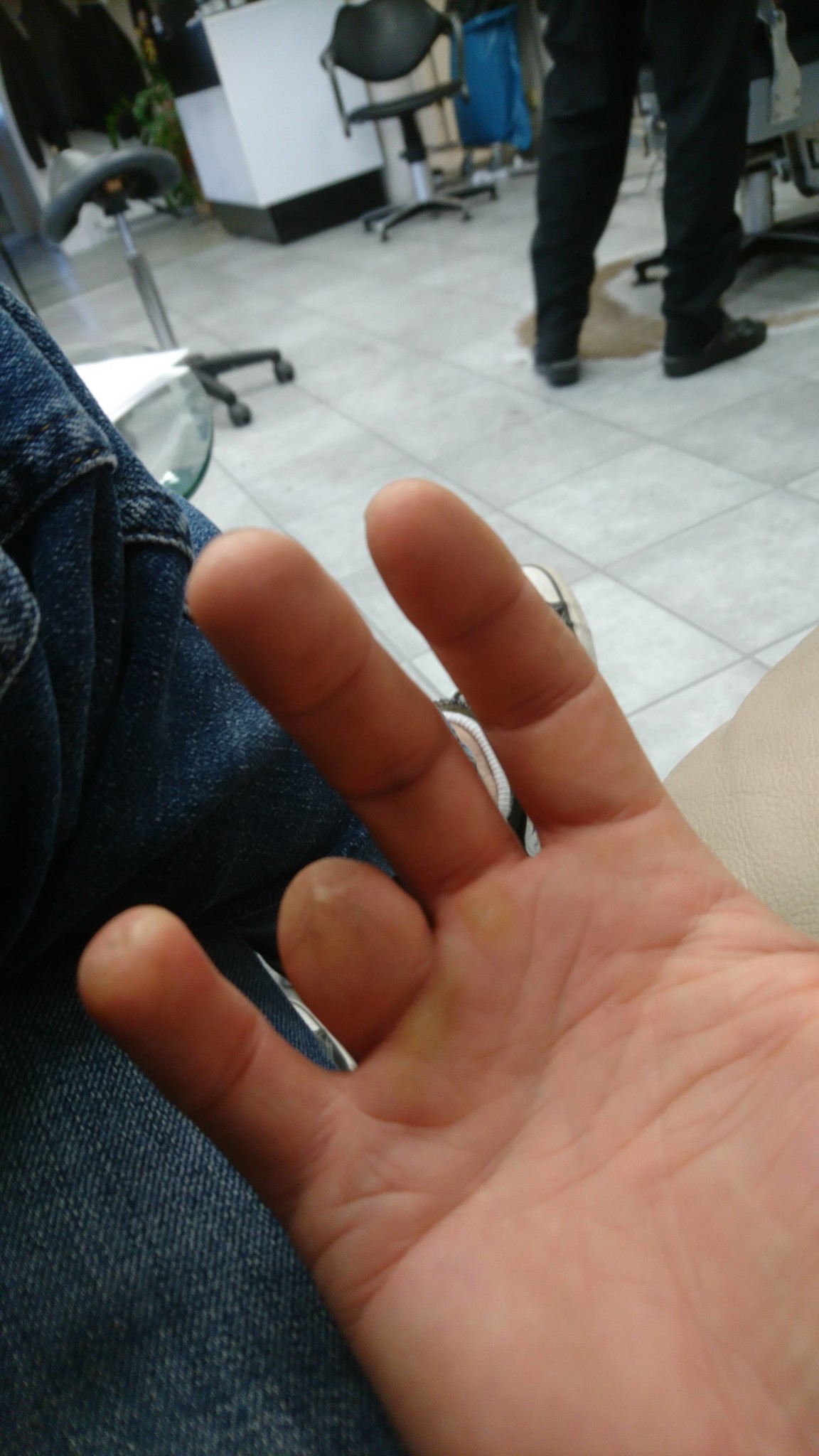 Sitter och läser i väntan på att bli klippt. Var tveksam till om jag skulle visa och berätta om mina 2 olyckor, mest pga skam antar jag. Men men... Första bilden illustrerar bortfräst vänster pekfinger. Jobbade och skulle enligt chef snabbt och med hyffsat precision göra en ljudabsorbents ram smalare inför ett ljudtest några timmar senare. Jag tänkte att jag tar bort det mesta av materialet i arbetsstycket i bordsfräsen med mallring och gör en mall som jag spänner stycket i. Jag ska fräsa cirka 25 bitar och det näst sista som ska fräsas smäller det i arbetsstycket. Jag tänkte direkt att detta inte var bra. Fingret har gått under kutterskyddet på något vis och pekfingret hänger i köttet strax under övre led. Mot akuten... Väl där ska akutläkaren snygga till fingret innan operation, han bedövar och jag får lyssna till hur han klipper i benet.