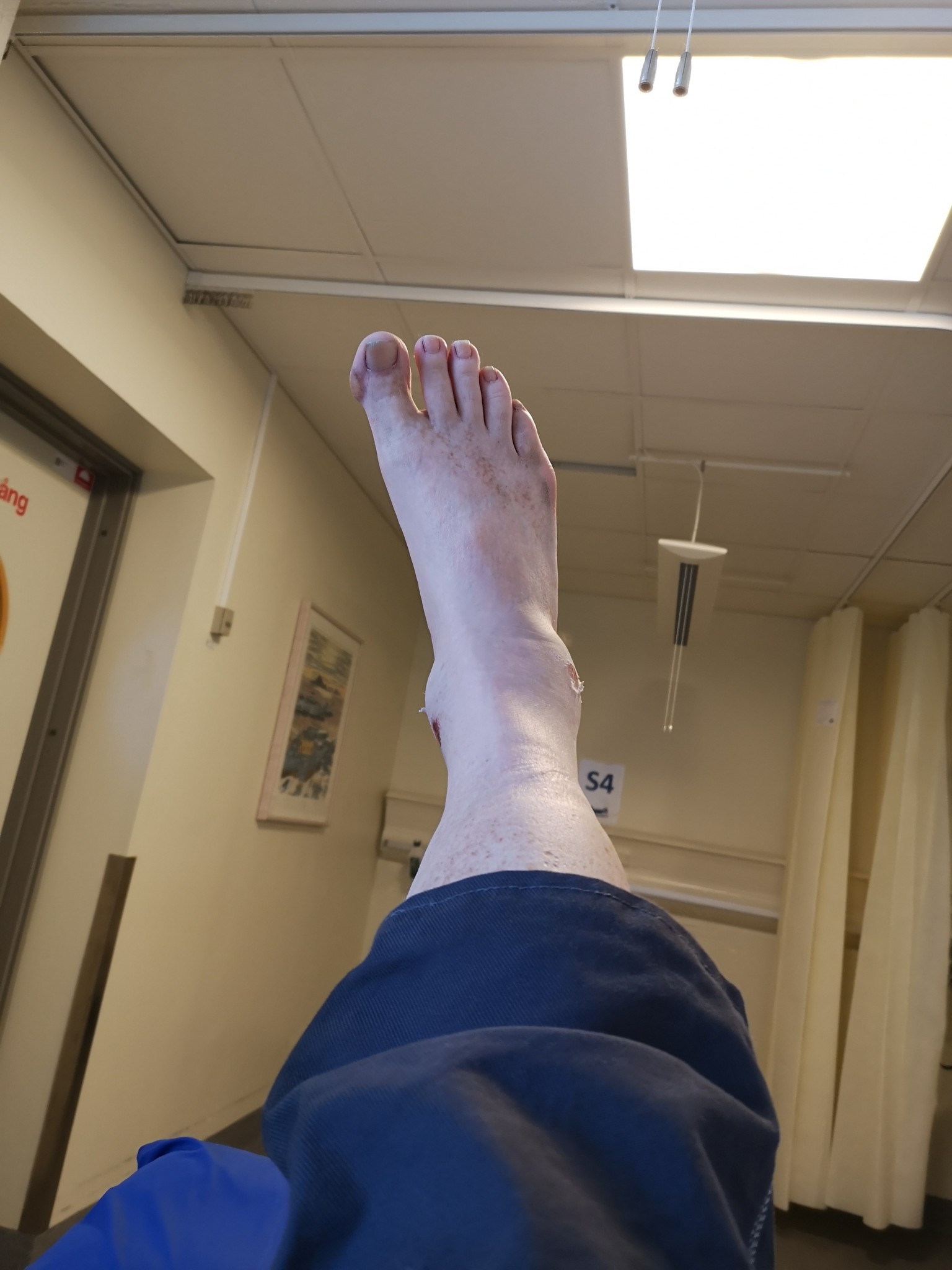 Efter ca 4timmar på akuten med röntgen och undersökningar fick jag beskeded ...Köp en trisslott på vägen hem...Du är felfri förutom kraftig svullnad och missfärgning.