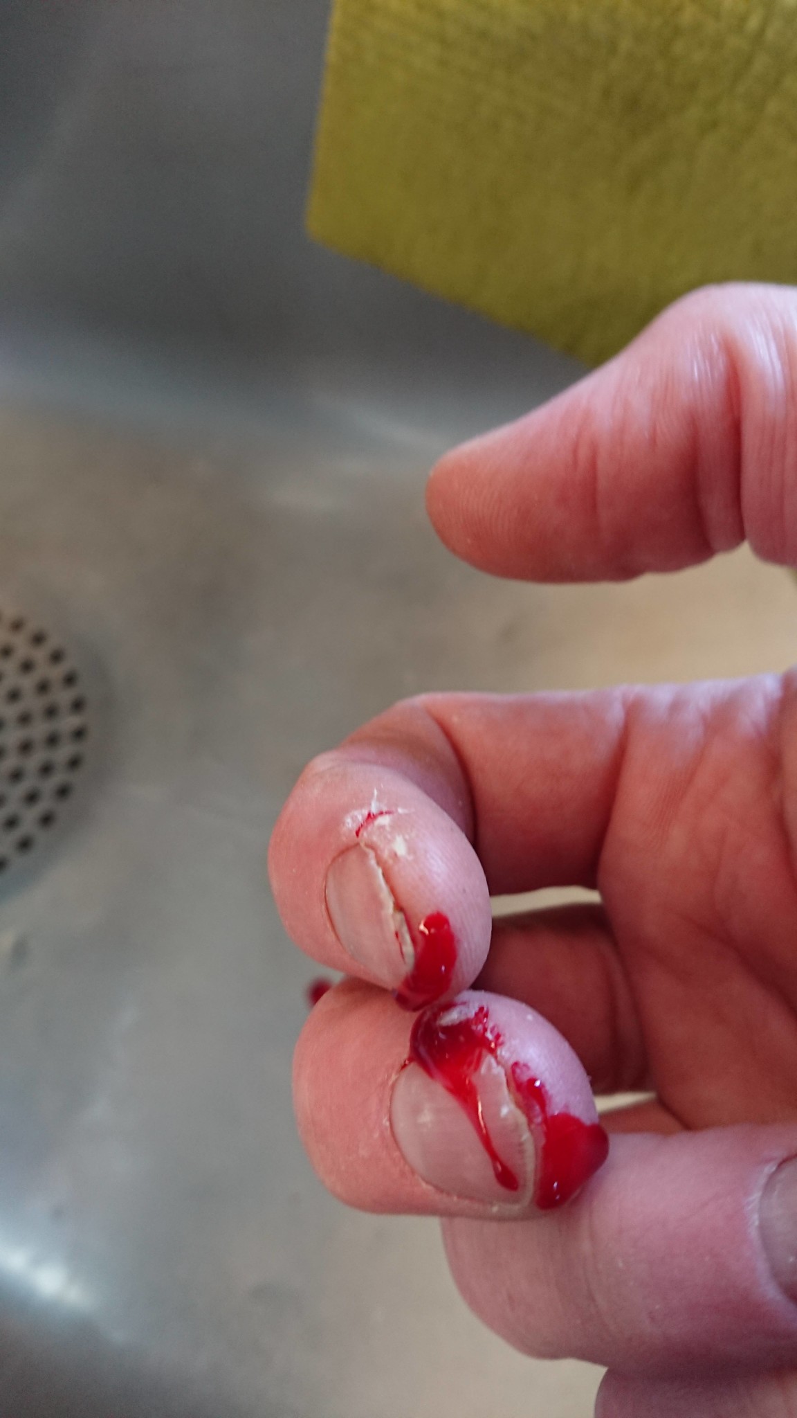 Håller på att göra en liten "potatislåda" som vi ska förvara tomma glasburkar i. Använde notklingan för att göra ett spår till botten men det första spåret blev lite för kort så istället för att försiktigt "lägga ner" träbiten på rätt ställe och flytta träbiten framåt så gjorde jag tvärtom. La ner biten mitt i spåret och backade träbiten som naturligtvis flög iväg varvid pek- och långfingret touchade klingan. Blodvite uppstod (se spoiler). Jag hade nog en jäkla tur för klingan tog bara lite hud och toppen på bägge naglarna (men utan att gå igenom naglarna).