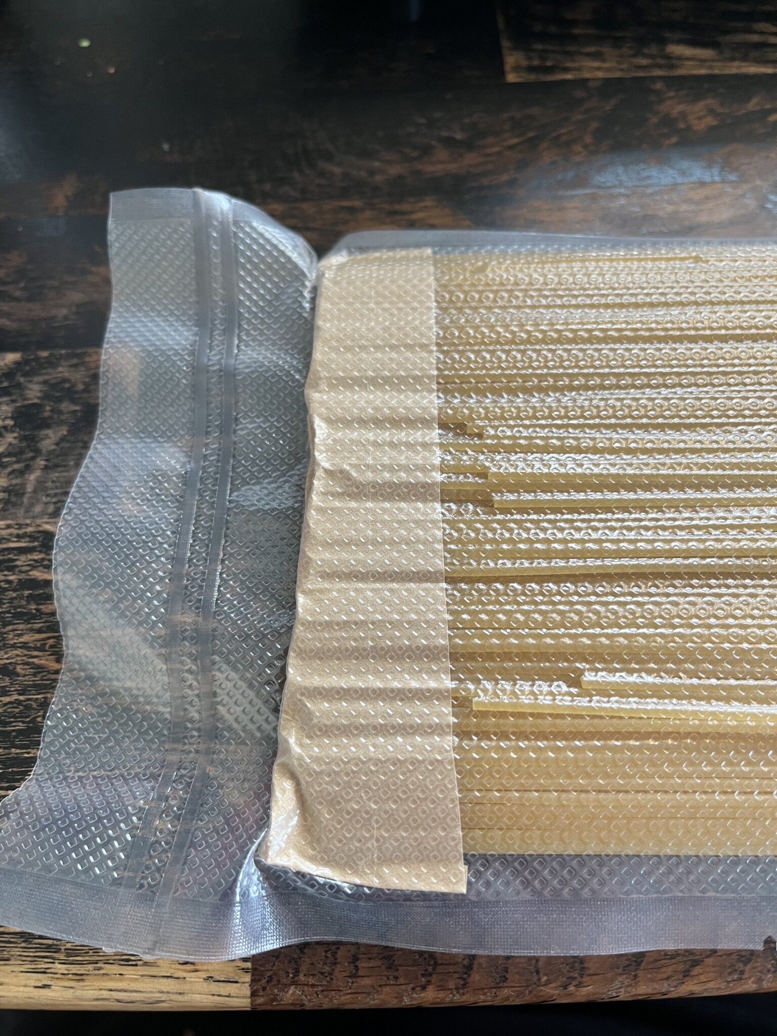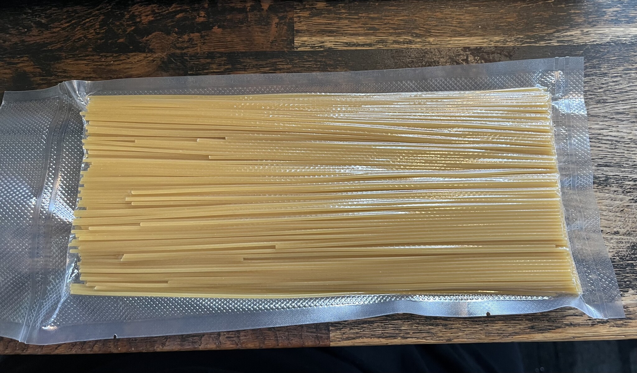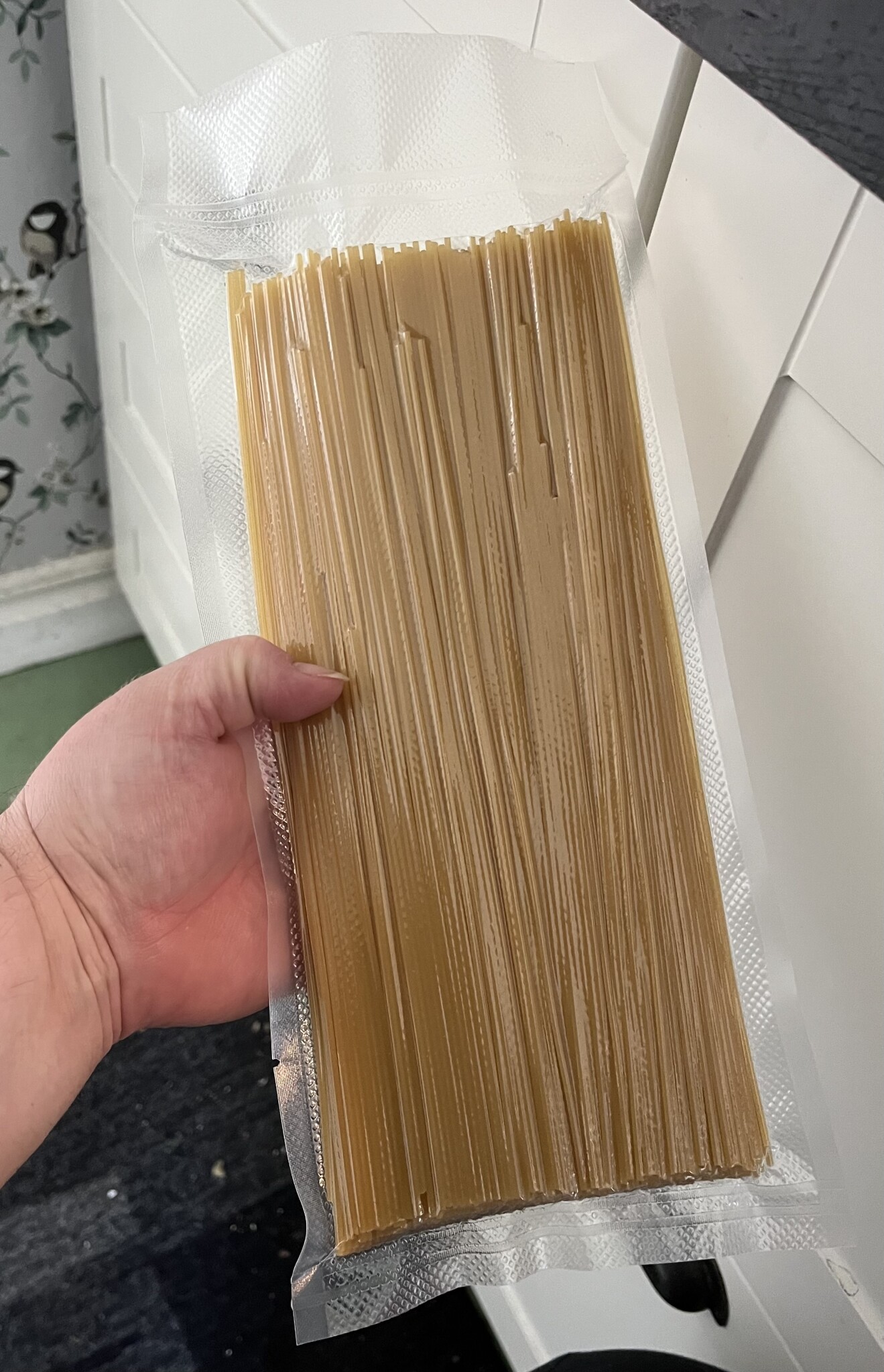 Däremot blev ett par av påsarna aningen för korta (ja, trots att jag fick välja själv.. men mitt ögonmått brast lite..) och då verkade ändarna på pastan se lite hm vassare ut mot plastkanten.. så jag la en liten pappersbit över dem där innan jag sög ur luften 👍