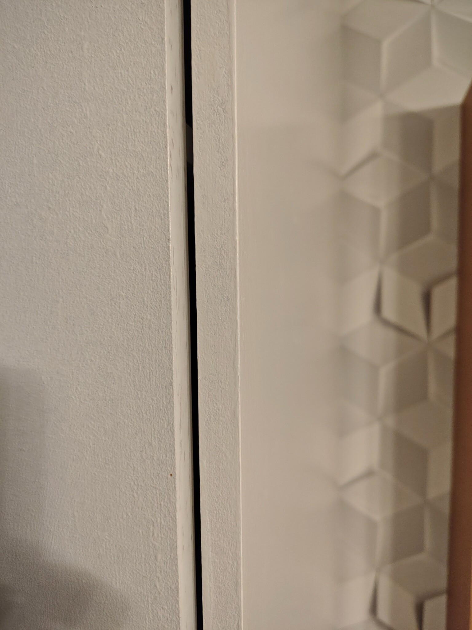Man ser gamla rollerstrukturen på sidan och på dörrkanten. På dörren ser man tapeten speglas. Tittar man riktigt nära syns det att dörren inte är riktigt slät. Den gamla färgen var jobbig att slipa ner.