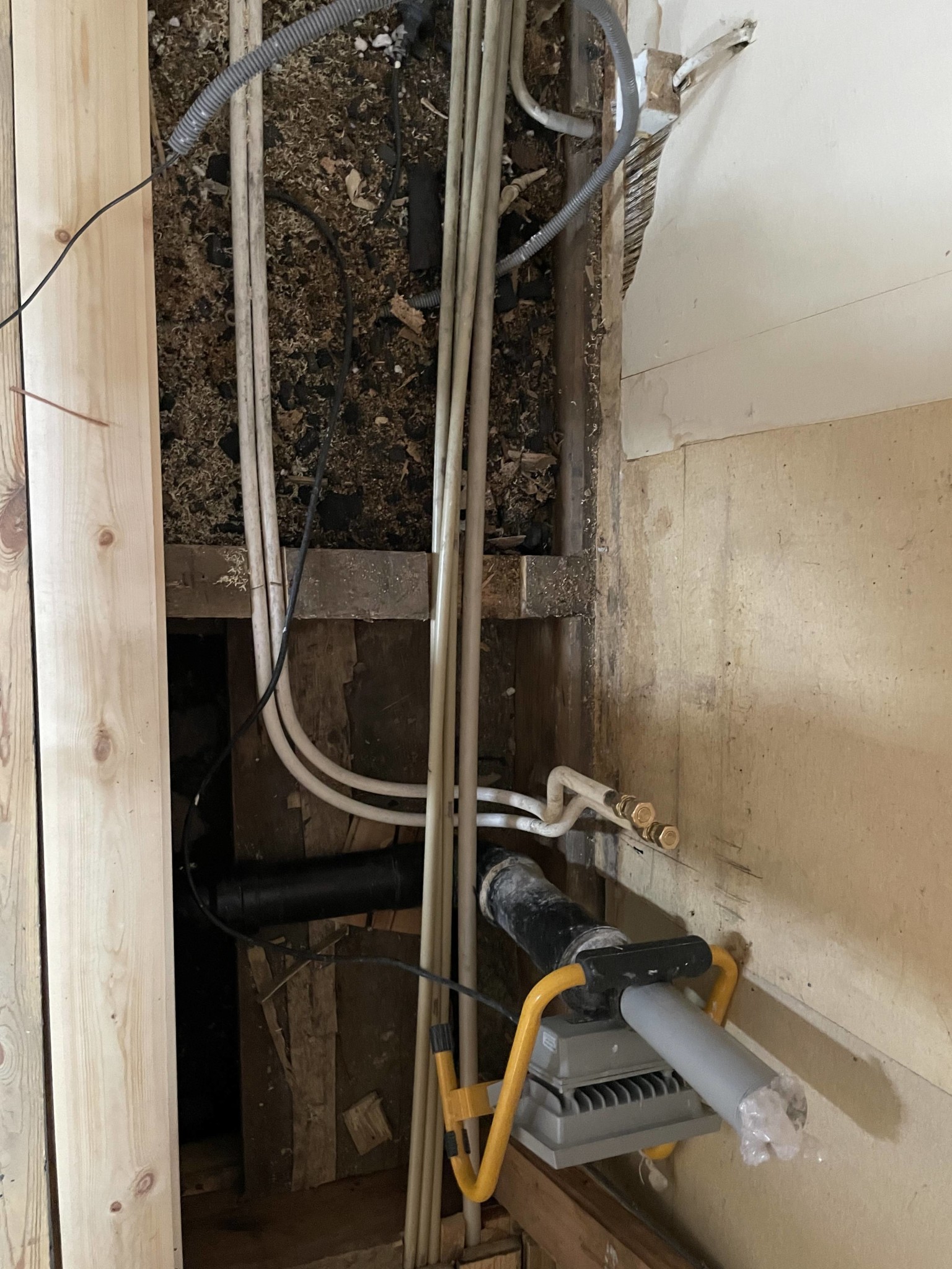 Vi ska byta kök och jag plockade bort golvet under diskhon och köksbänkarna för att inspektera en potentiell fuktskada, och frilagde därmed även prisolrören till vattnet. De är dragna precis under innergolvet utan isolering och vägg-i-vägg med varandra.