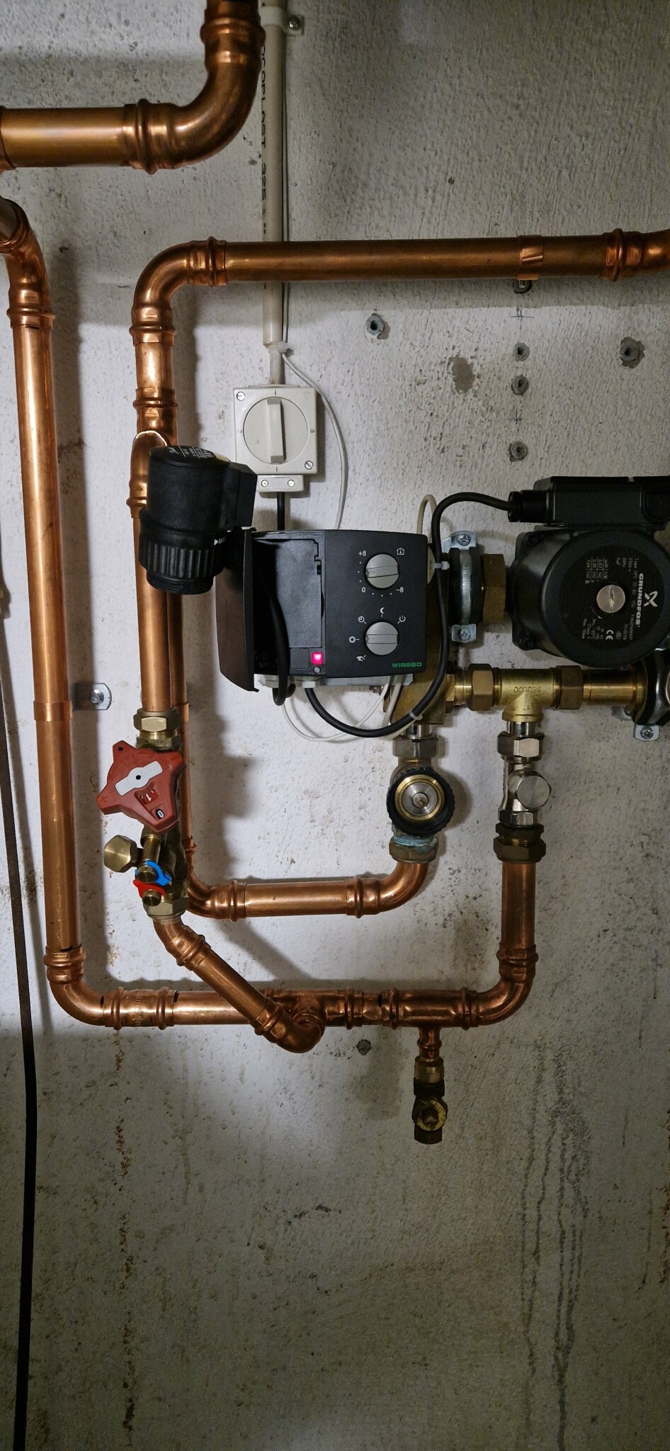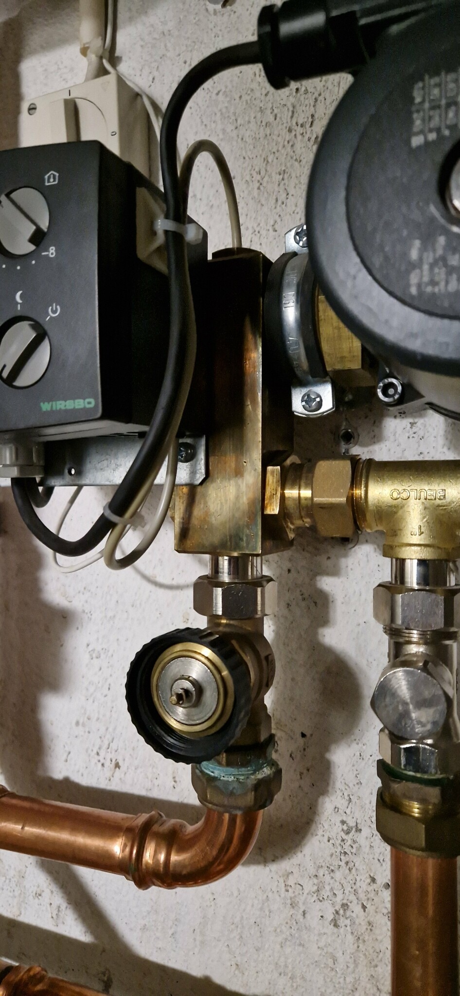 Pannan ger bra värme och vi har ca 40-50grader i tankarna, problemet är att det bara kommer ut 25gradigt vatten till golvvärmen. Jag har försökt hitta fel och försöker förstå var problemet kan ligga. Min gissning är att det är i en reglerings ventil som på första bilden. Det som jag har svårt att förstå är att även om jag skruvar bort det elektriska ställdon som heter Danfoss ABV-NC no. 082f0051 så spelar det ingen roll. Då var min tanke att det kanske ska vara så att den ska vara max intryckt istället och därför prövat att trycka in den med en hand tving och det gör inte heller någon skillnad.
