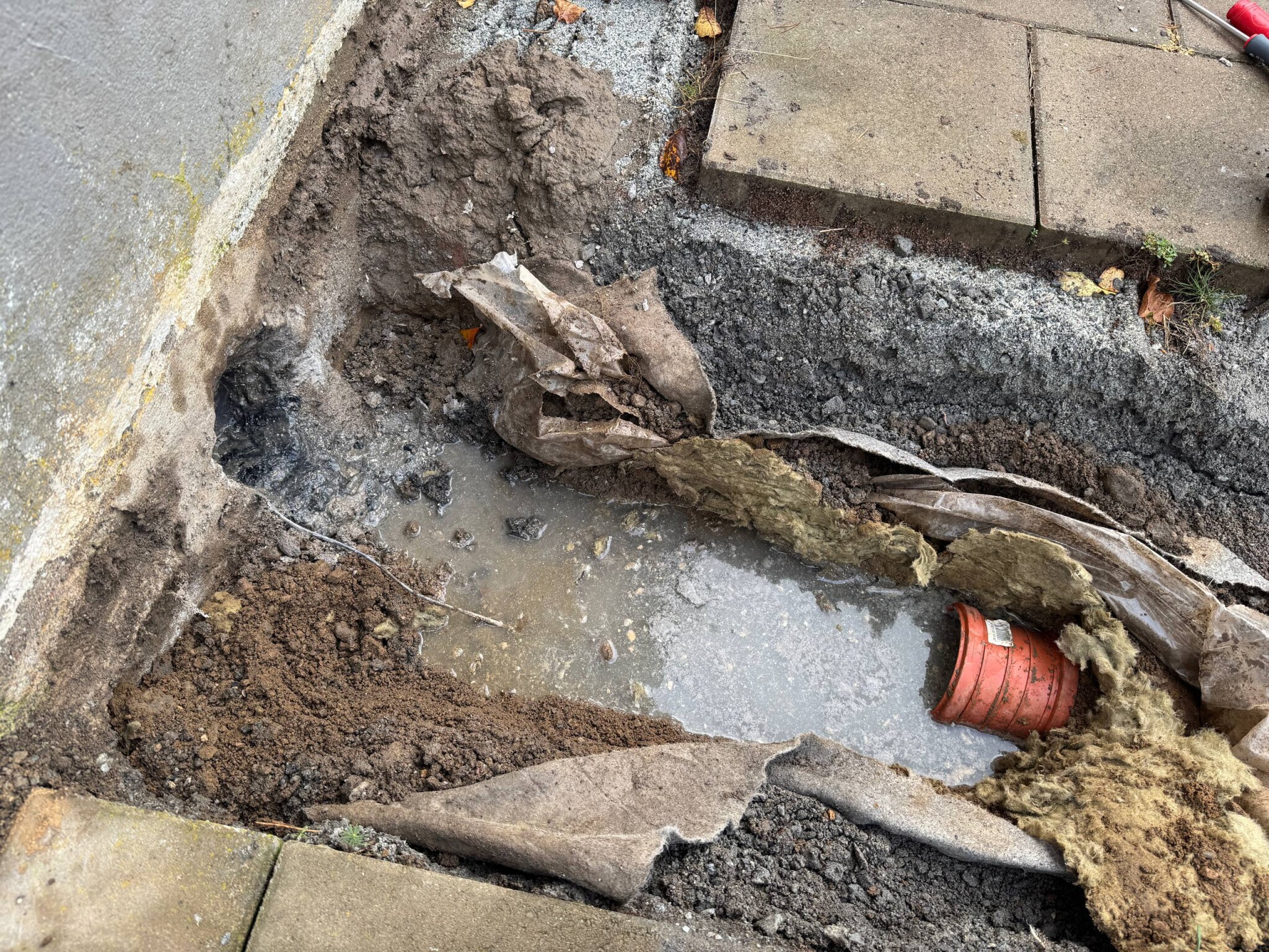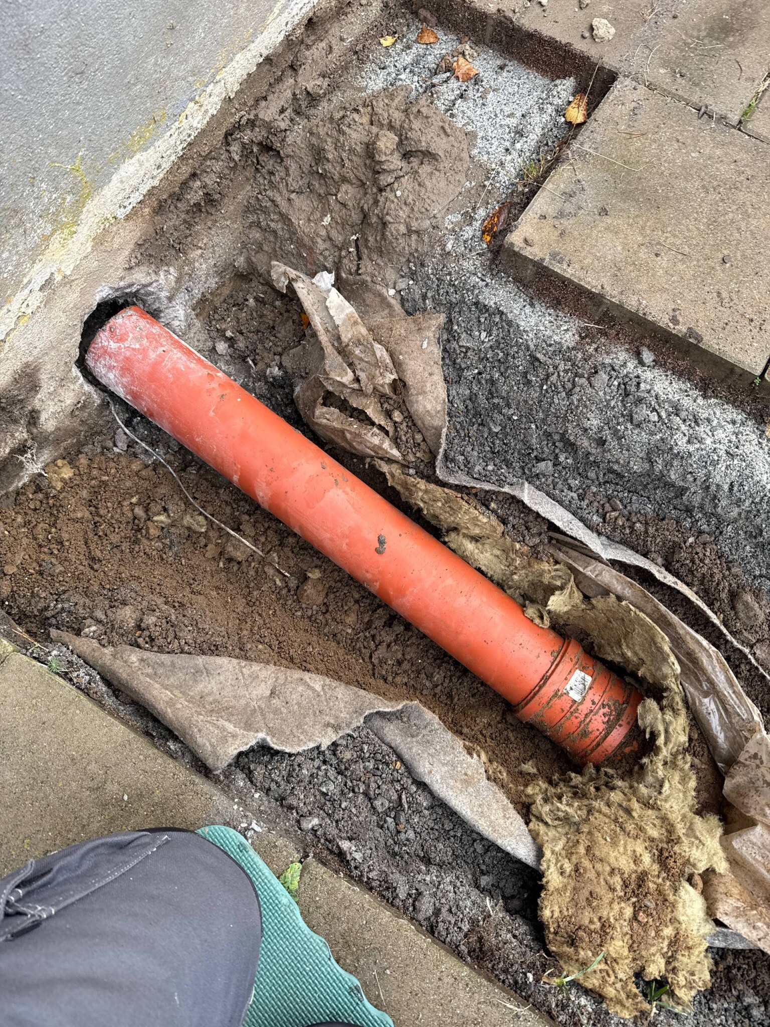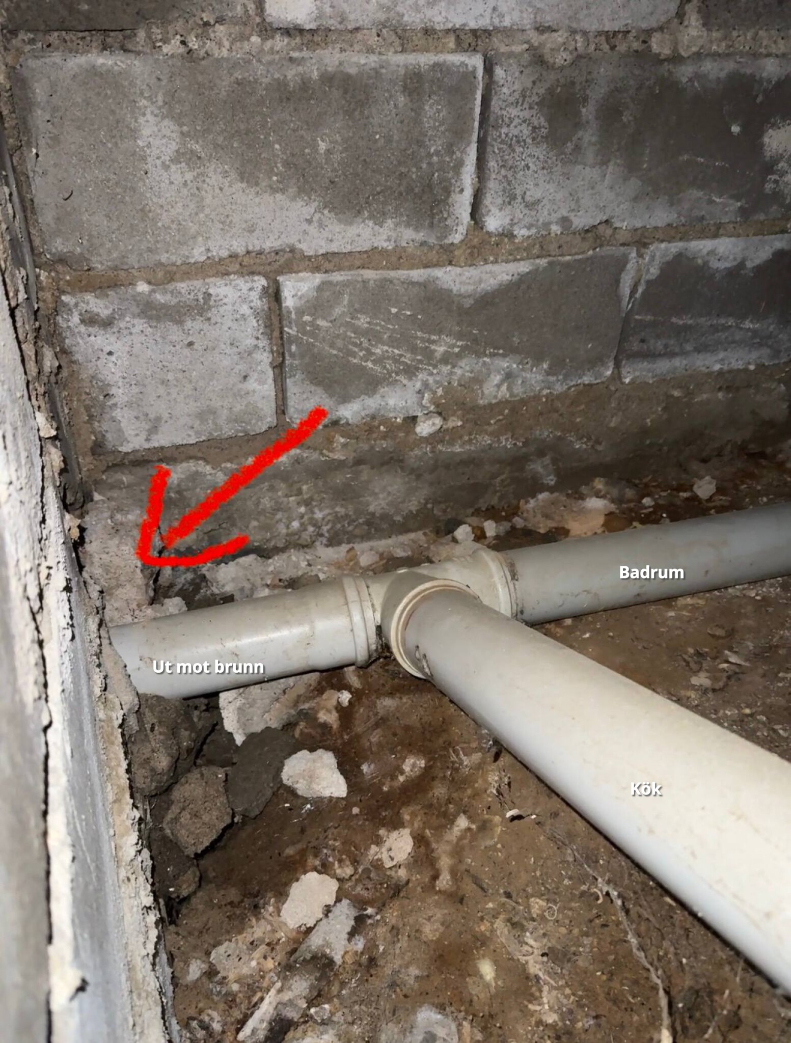 Förstår inte riktigt hur dom tänkt när dom gjorde grundinstallationen. Hittar ingen koppling från 75 röret som kommer ut ur väggen och 110 röret som satt där innan, så de hade till synes bara lagt ett 110 rör mot väggen där 75an kommer, gjutit betong runt om och brutit det några grader nedåt för att koppla på 110 muffen i backen.