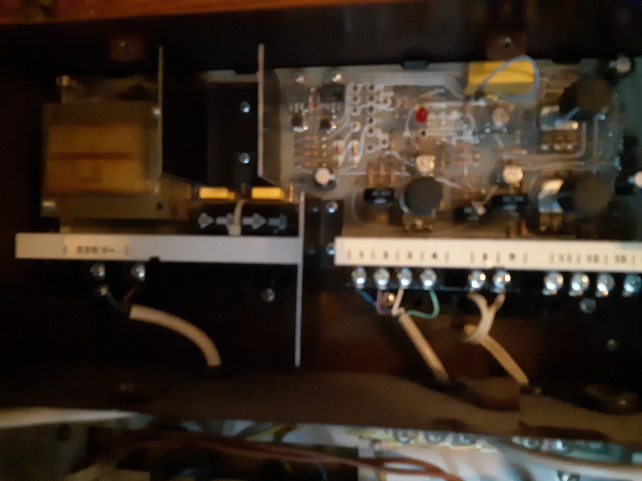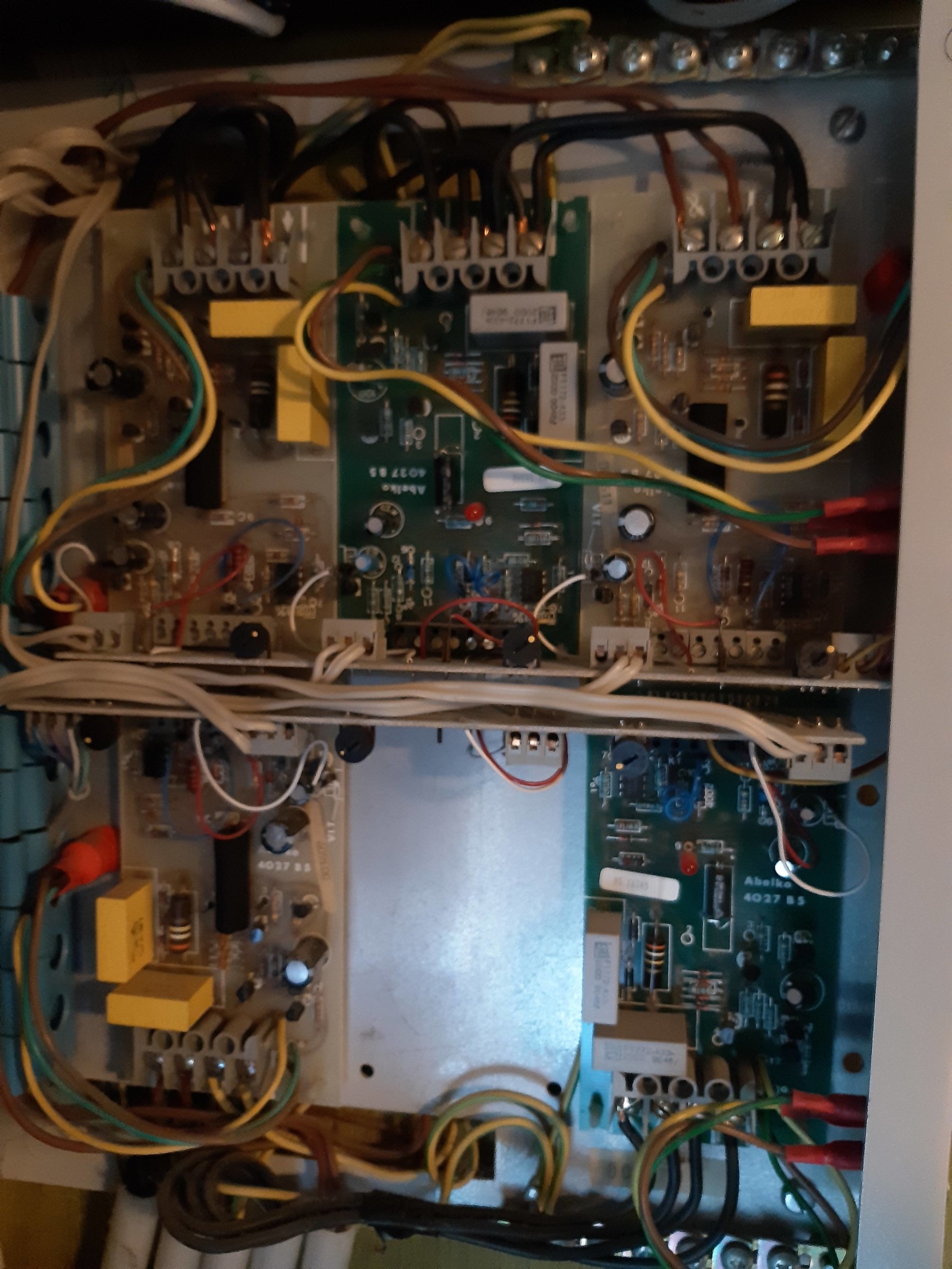 Till den övre delen är det ut som på denna otydliga bilden jag tog tidigare. Tunna kablar från den större enheten och två till ett uttag men det kvittar om de är kopplade eller inte för jag prövade koppla loss kablarna till den. Till den undre ser det ut som på den tidigare bilden med kretskorten. Blir till att ringa en el gubbe och hoppas på den snabb lösning efter löning.