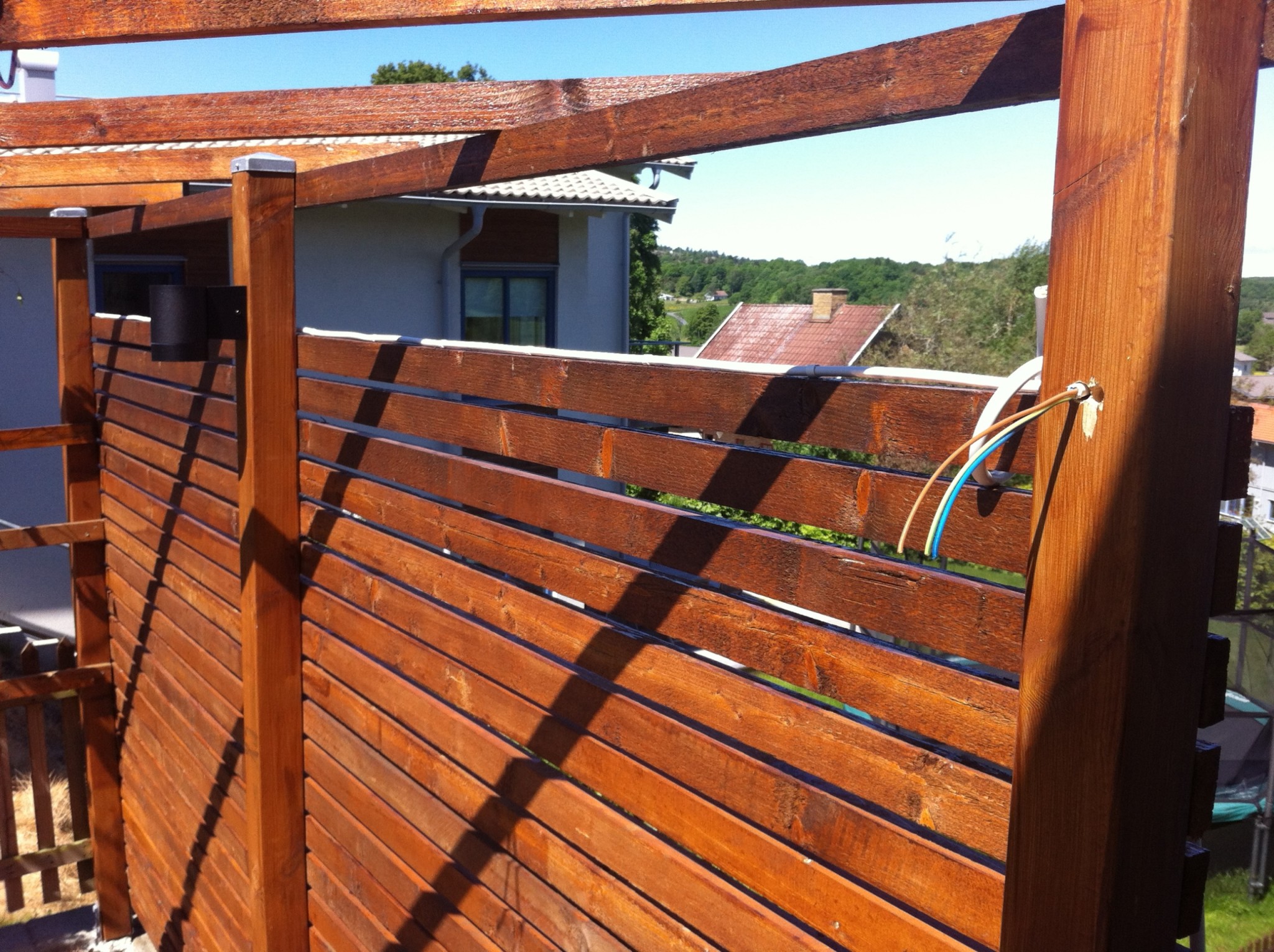 Kabeln går längs med ribban till nästa sportligt, vidare runt hörnet och vidare (Bild 7) till 2st spotlight längs långsidan på staketet (Bild 8), av dessa så är en spot monterad och en är kabel framdragen. Kablen skall sedan forsätta till nästa sida av uteplatsen och där ska 3st spotlights monteras (Bild 9).