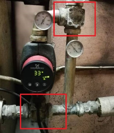 Du har ett flödesproblem , pumpen ska alltid snurra , utom vid uppstart av pannan ( sitter kanske en termostat i pannan som startar den ) en riktigt gammal luring till laddning , det sitter någon form av bimetall i fyrkanterna som ska shunta ut från pannan , kan vara så att dom inte är friska , du får öppna och titta , vet ej om det finns reservdelar till din , annars får du byta