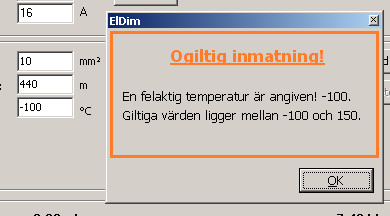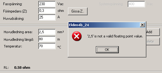 Felmeddelandet när man väljer klen ledararea relativt säkringen är helt missvisande. Det borde stå Varning: Underdimensionerad ledning för vald säkring, inte Ogiltig kombination av spänning/ström inmatad.