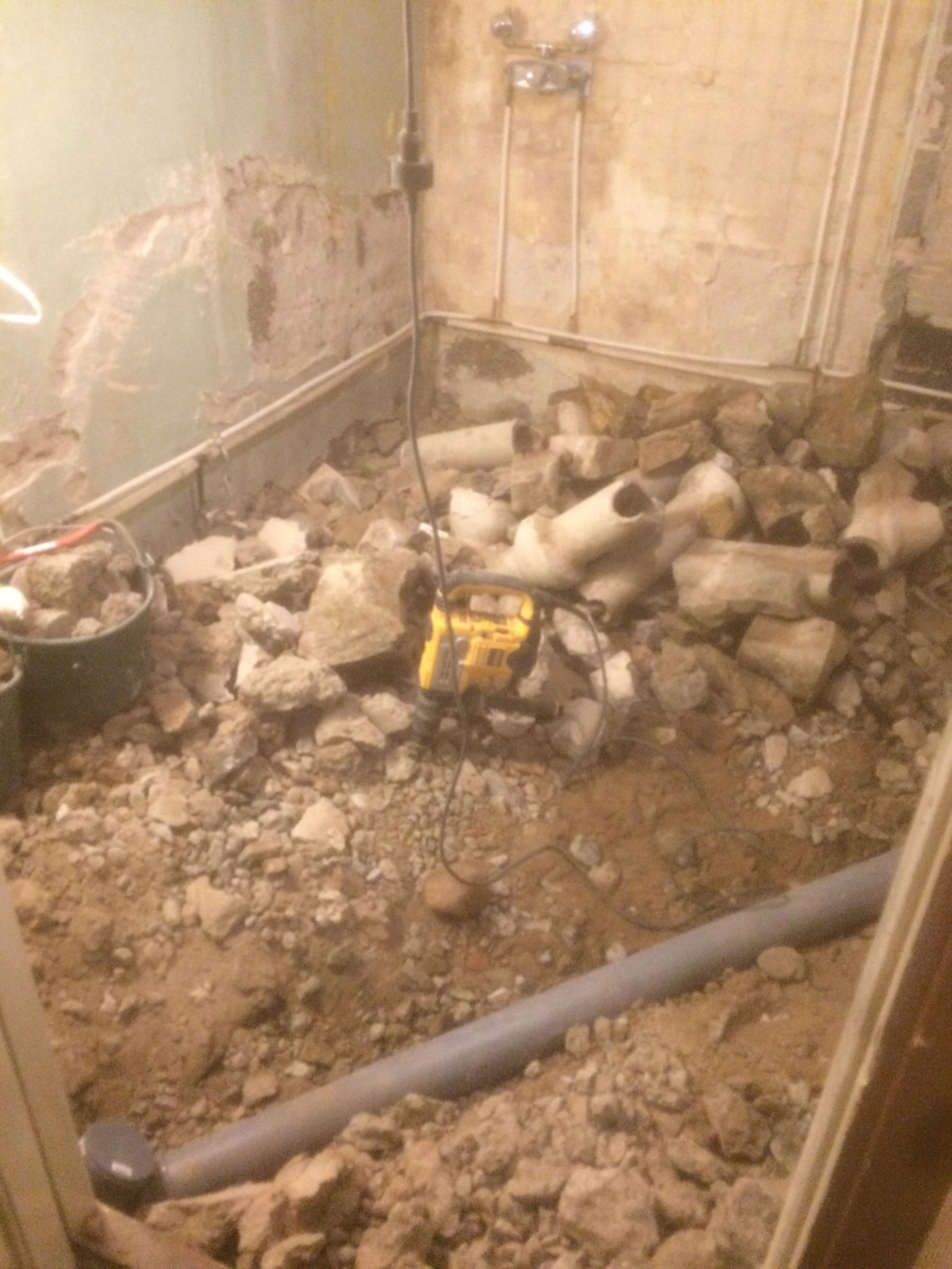 Min plan är som följer - Riva Golv - Förlägga rör, golvvärme, isolering, armering, koppla över VA - Gjuta. Sen tar vi tag i väggarna inför plattsättning fuktspärr osv...