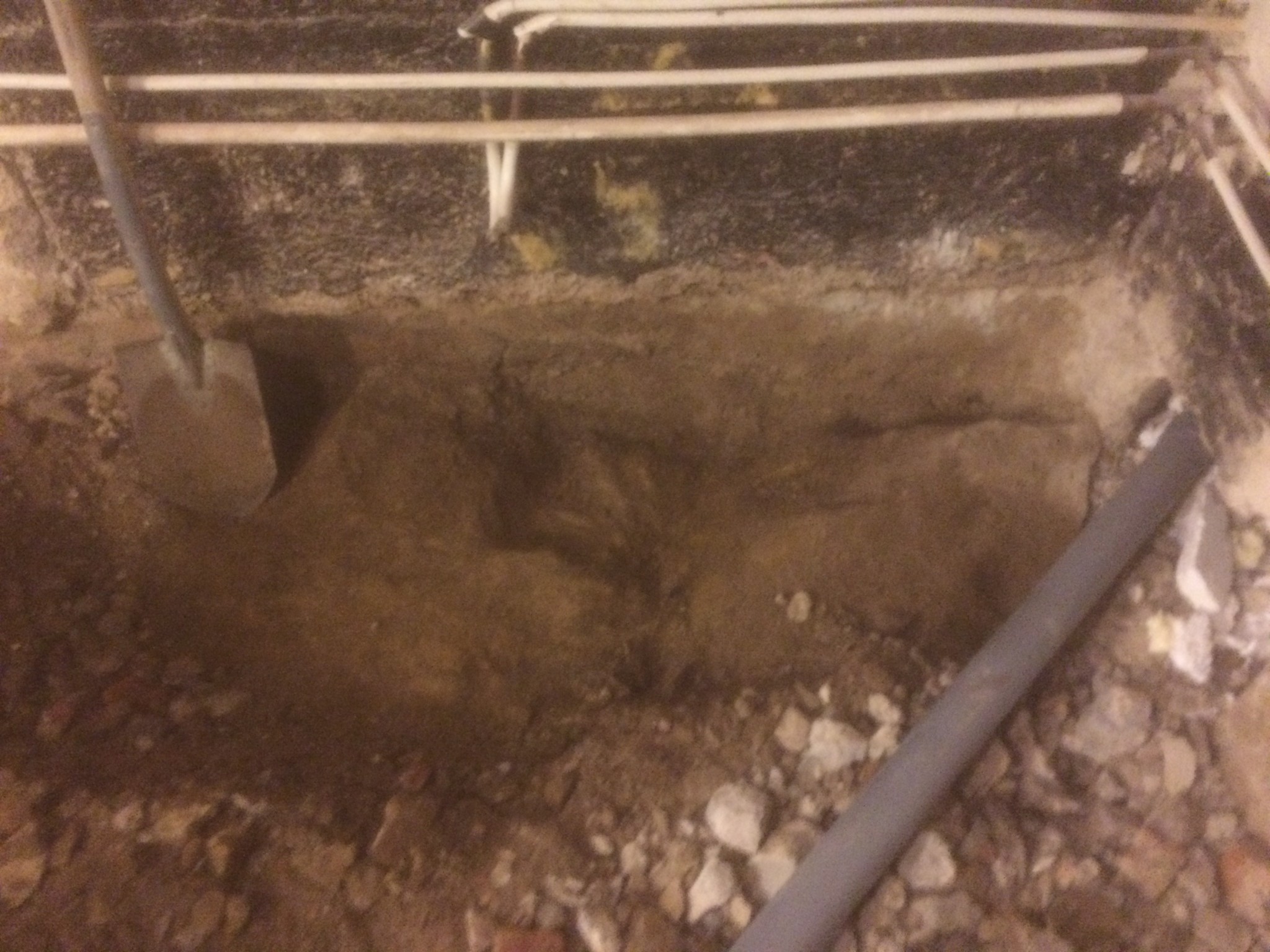 Lilla maskinen fick picka fram avloppet då betongrören fortfarande används för tvättstuga och kök.