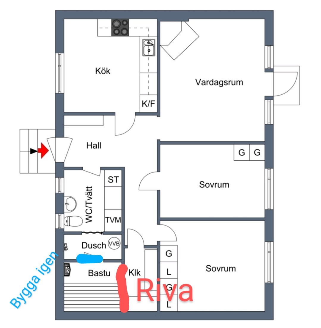 Jag har påbörjat en ombyggnation där jag har börjat riva väggen mellan bastu och klädkammare för att göra detta till ett ca 7kvm stort kontor/klädkammare.