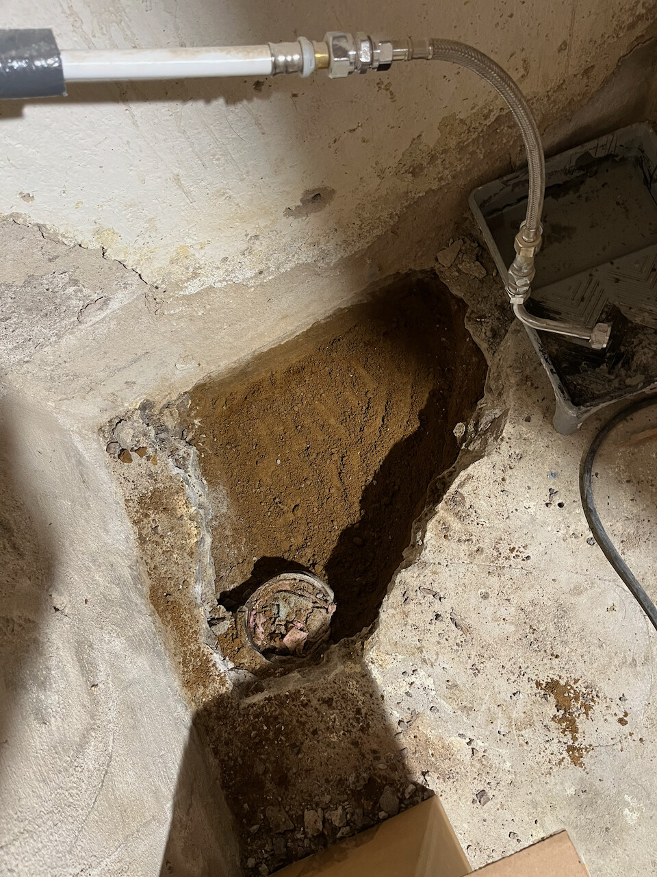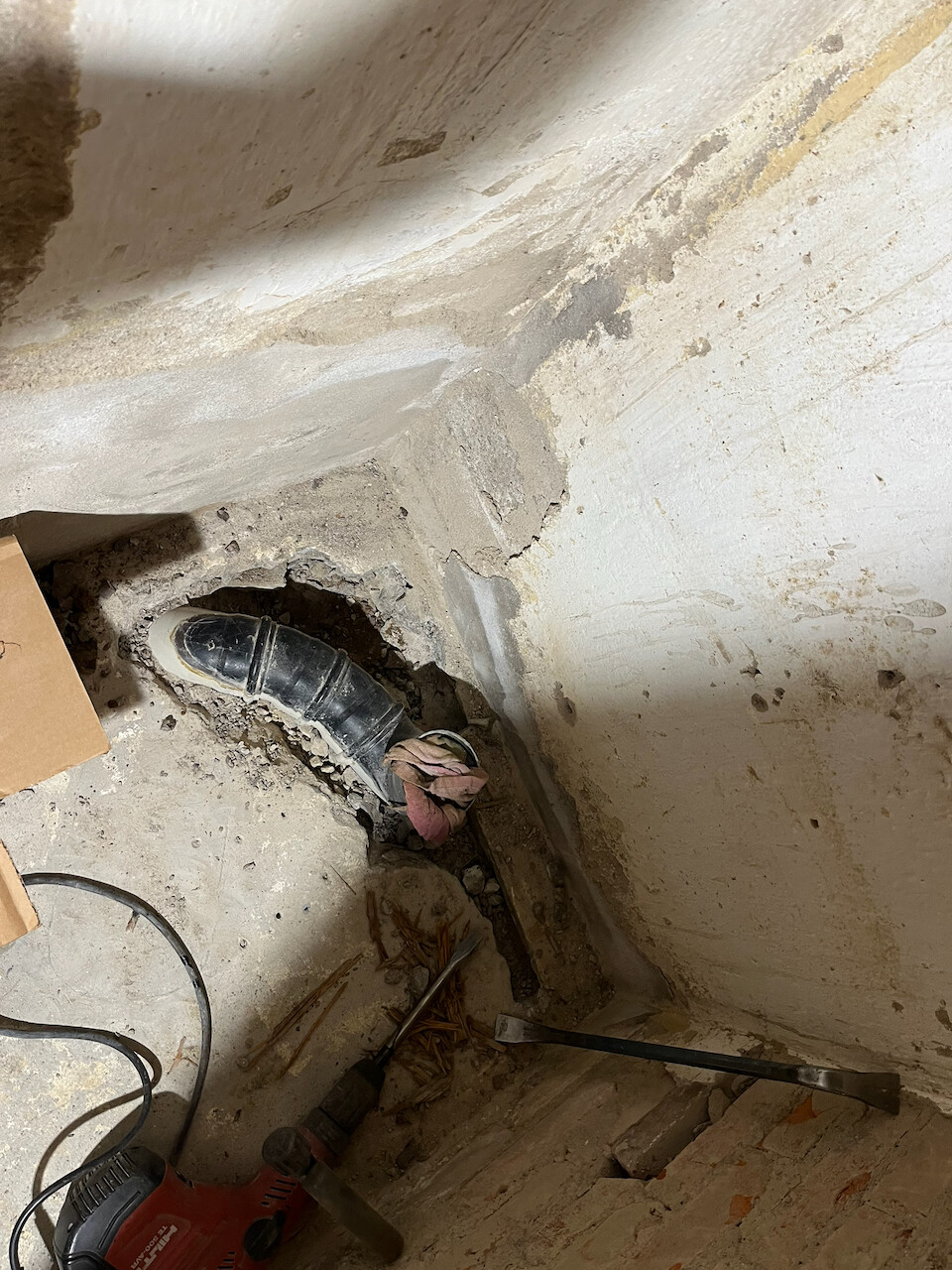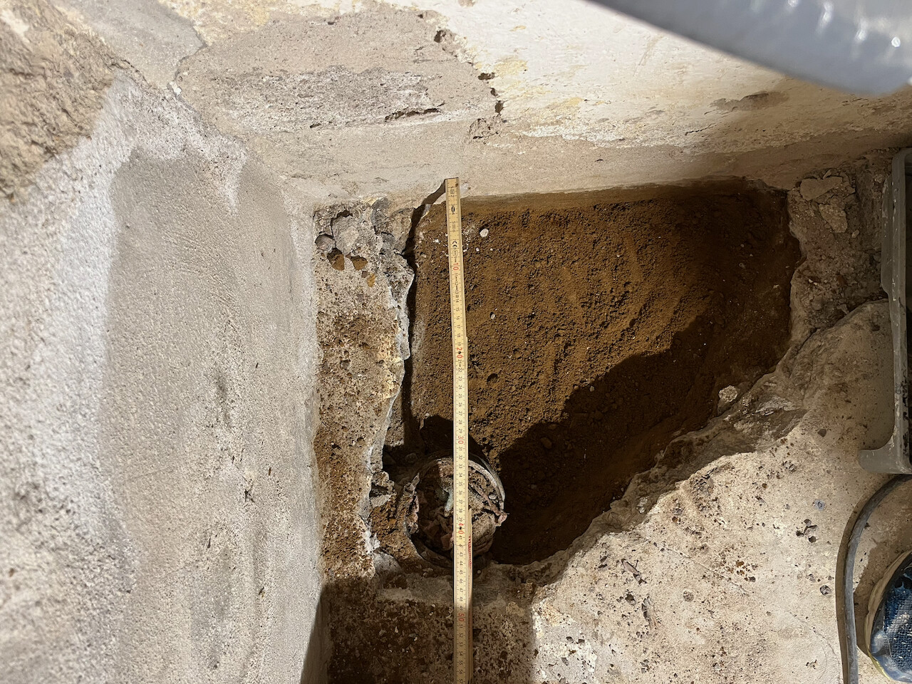 Idag har jag bilat upp golvet så att vi kan dra nytt avlopp. Jag behöver kapa den gamla gjutjärnsstammen för att få ner det nya avloppet tillräckligt långt ner i marken (det gamla stack upp ovanför golvet som synes på bilderna), så beställde en Bosch GWS mini-kap för ändamålet (bra pris på Amazon, och den levereras i morgon). Har ändå haft behov av en dylik, så nu blev jag äntligen tyvärr tvungen att köpa en… 😇