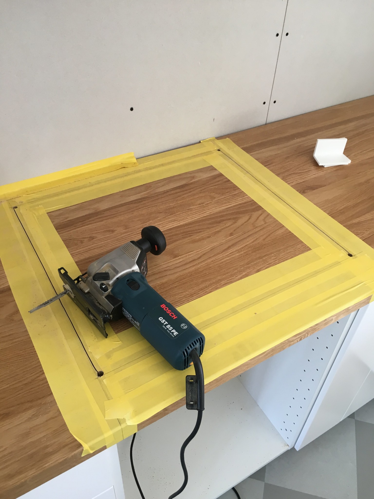 Idag har jag borrat och sågat ett stort hål i vår fina bänkskiva. Inte så roligt att sätta sågen i den.... Men jag tror att det blev bra iaf.