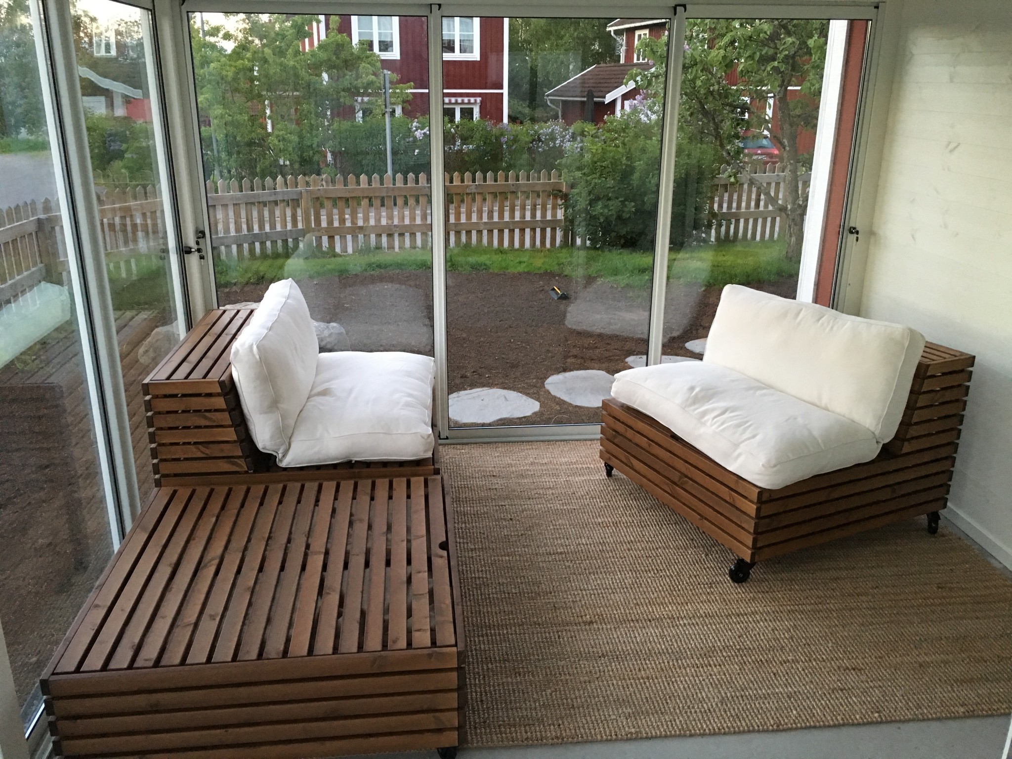 Idag kom leveransen av möblerna till uterummet, stora och mycket sköna! Funkar både som soffa och fåtöljer. Enkelt att flytta om dom då dom har hjul, samt förvaring inuti