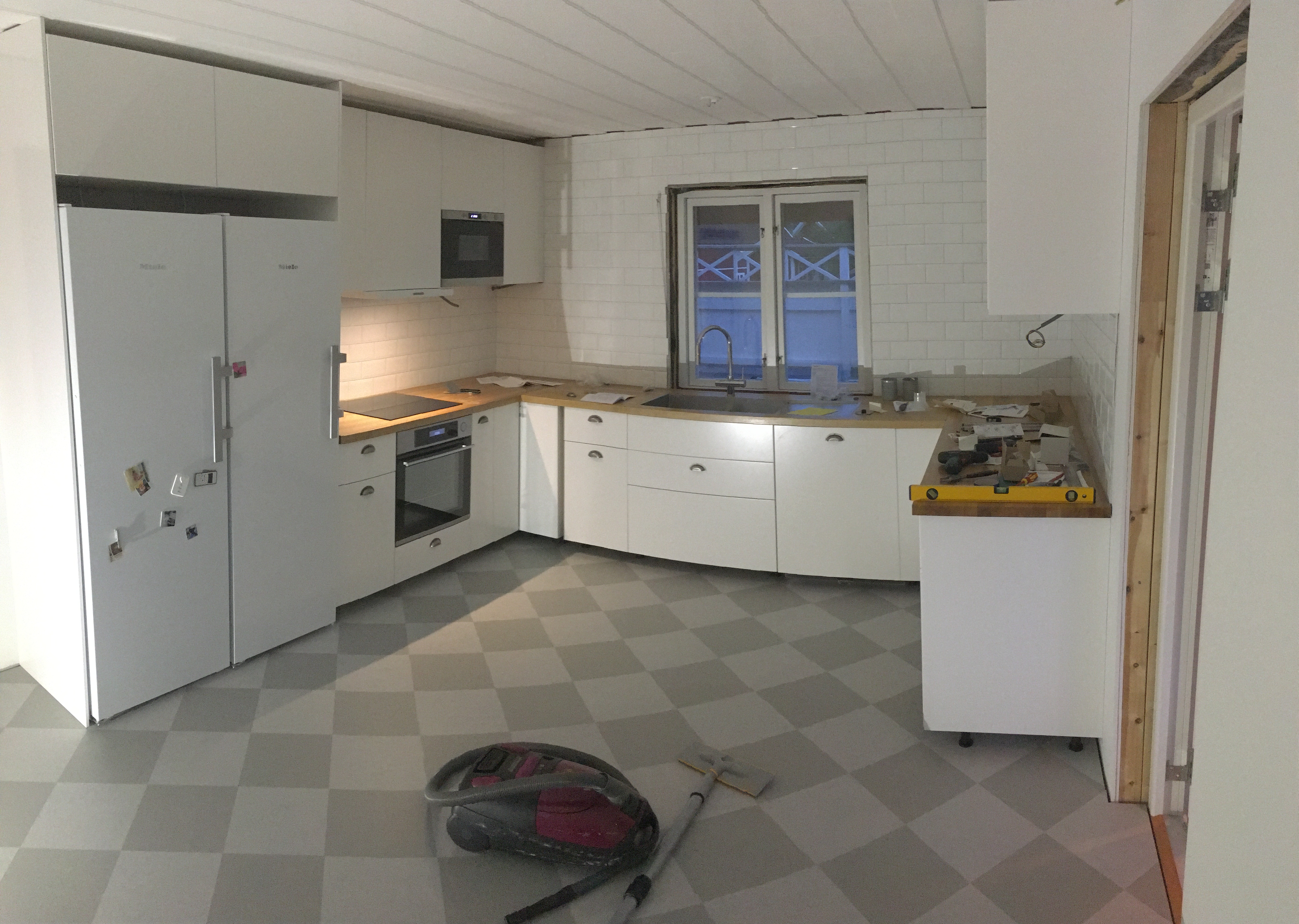 Inte långt kvar nu, har skruvat upp knoppar och de sista handtagen idag. Och premiärmiddag i köket ikväll