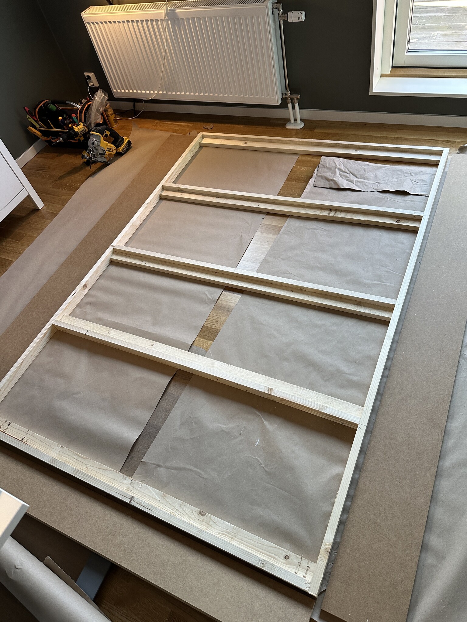 Först tillverkade vi en sängram, vi körde efter en 140 bred madrass för att få plats med lite skåp och hyllor bredvid sängen.