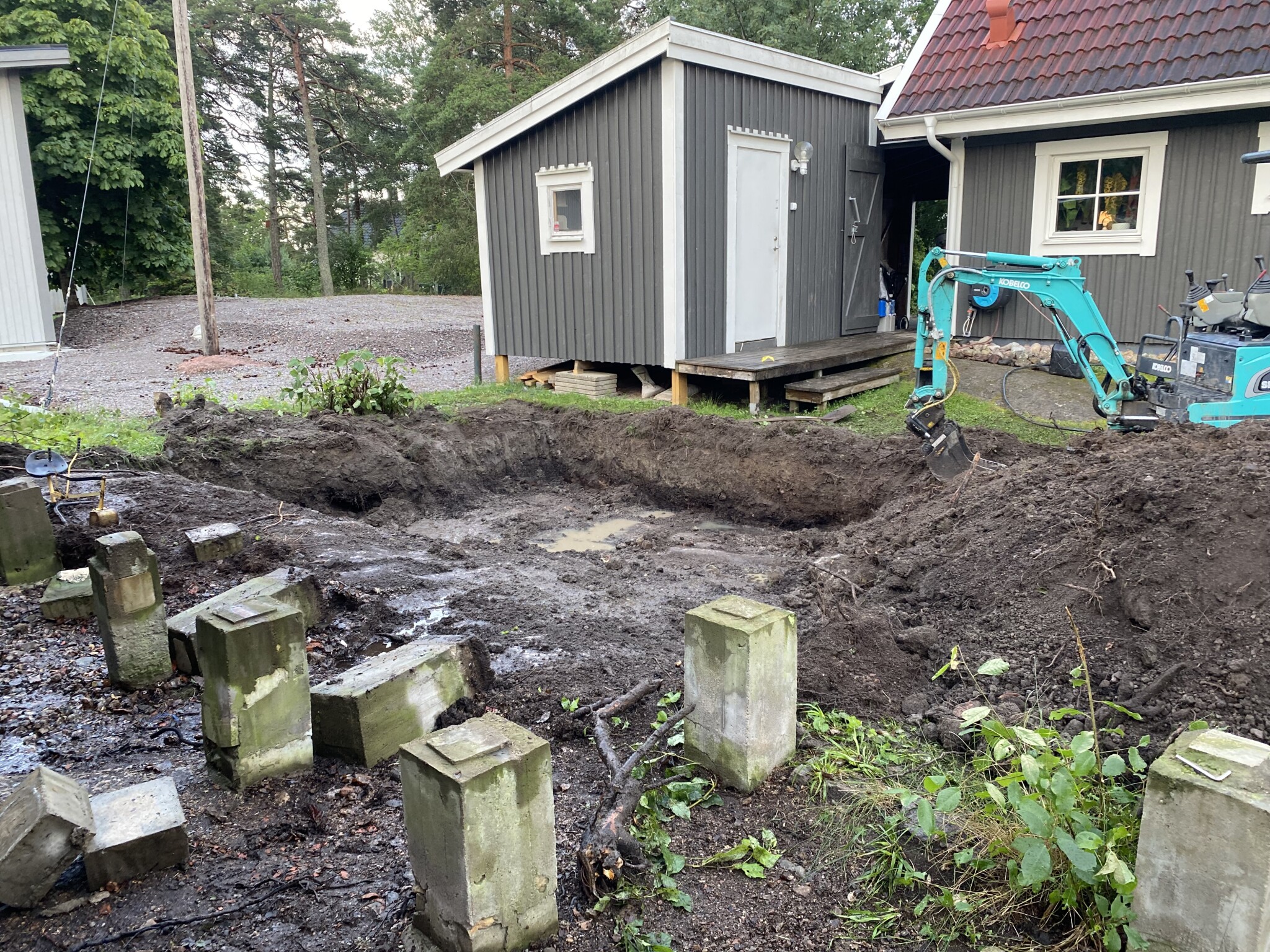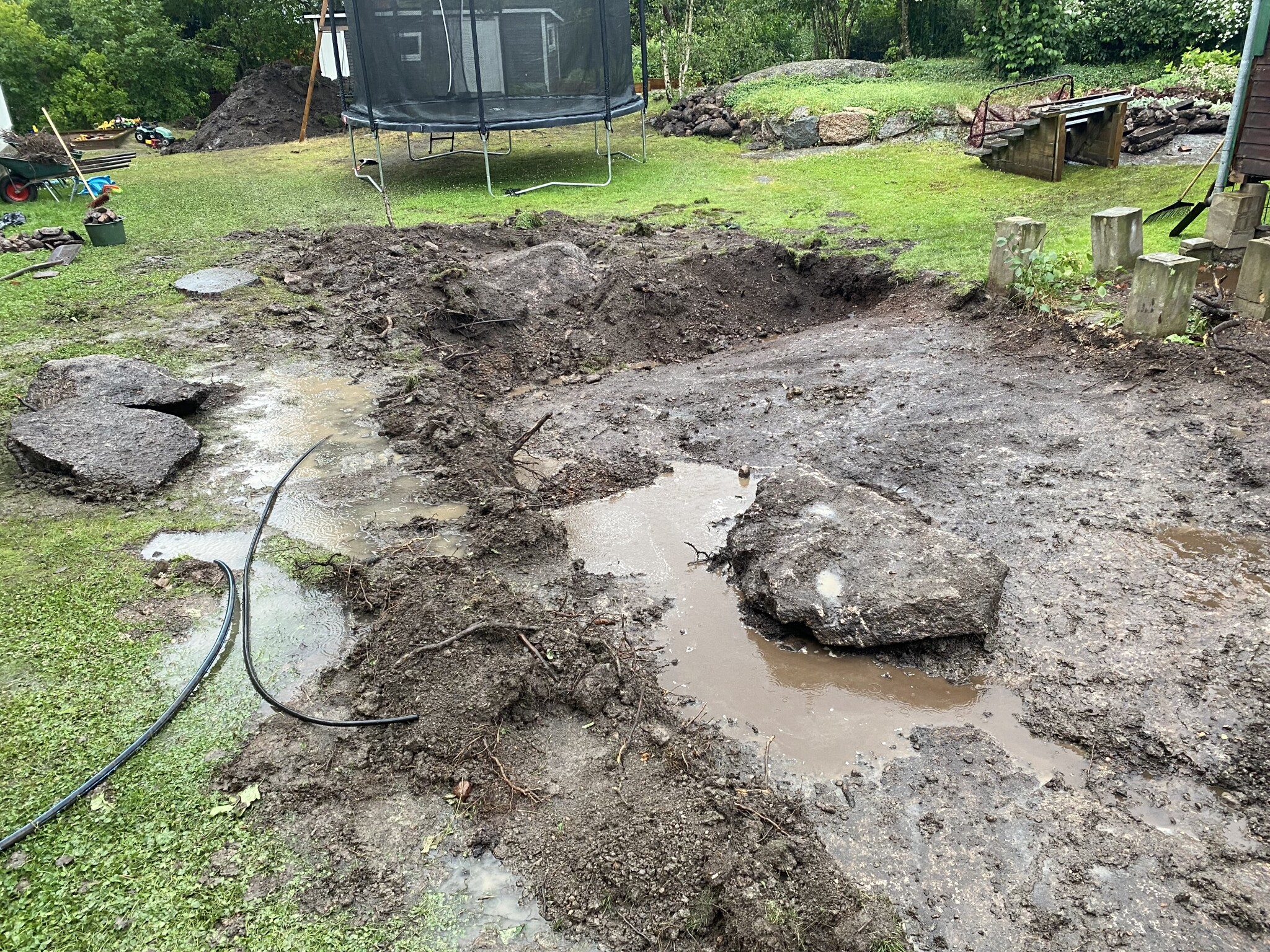 Hoppas du direkt förklarade för familjen att poolen nu är färdig och att du därför är klar med din del av arbetet.R random_name skrev:8:e juli var en regnig dag och det regnade över 40 mm och hela hålet blev vattenfyllt. Det är ganska bra tillrinning till hålet men detta var extremt. Vid "vanligt" regnväder blir det inte i närheten av dessa mängder i gropen. Hålet jag grävt är större än vad poolen ska bli. När jag gräver igen det hoppas jag att jorden fördröjer vattnet lite. Men det måste såklart pumpas bort. Planen är att pumpa det till en stenkista på framsidan. Samtidigt ska jag leda bort vattnet från taket så inte det rinner ner i hålet, och på så sätt också minska mängden vatten en aning.