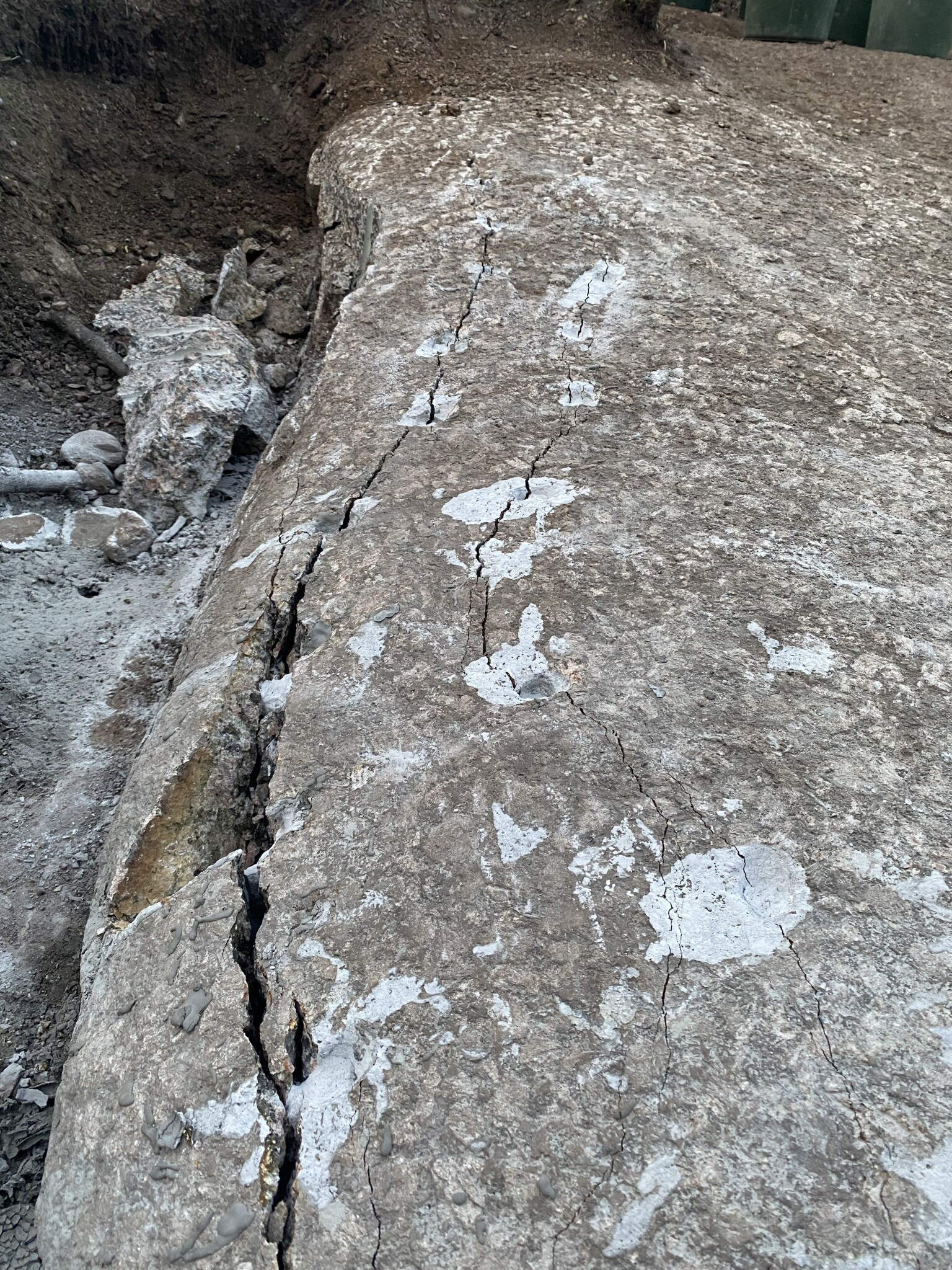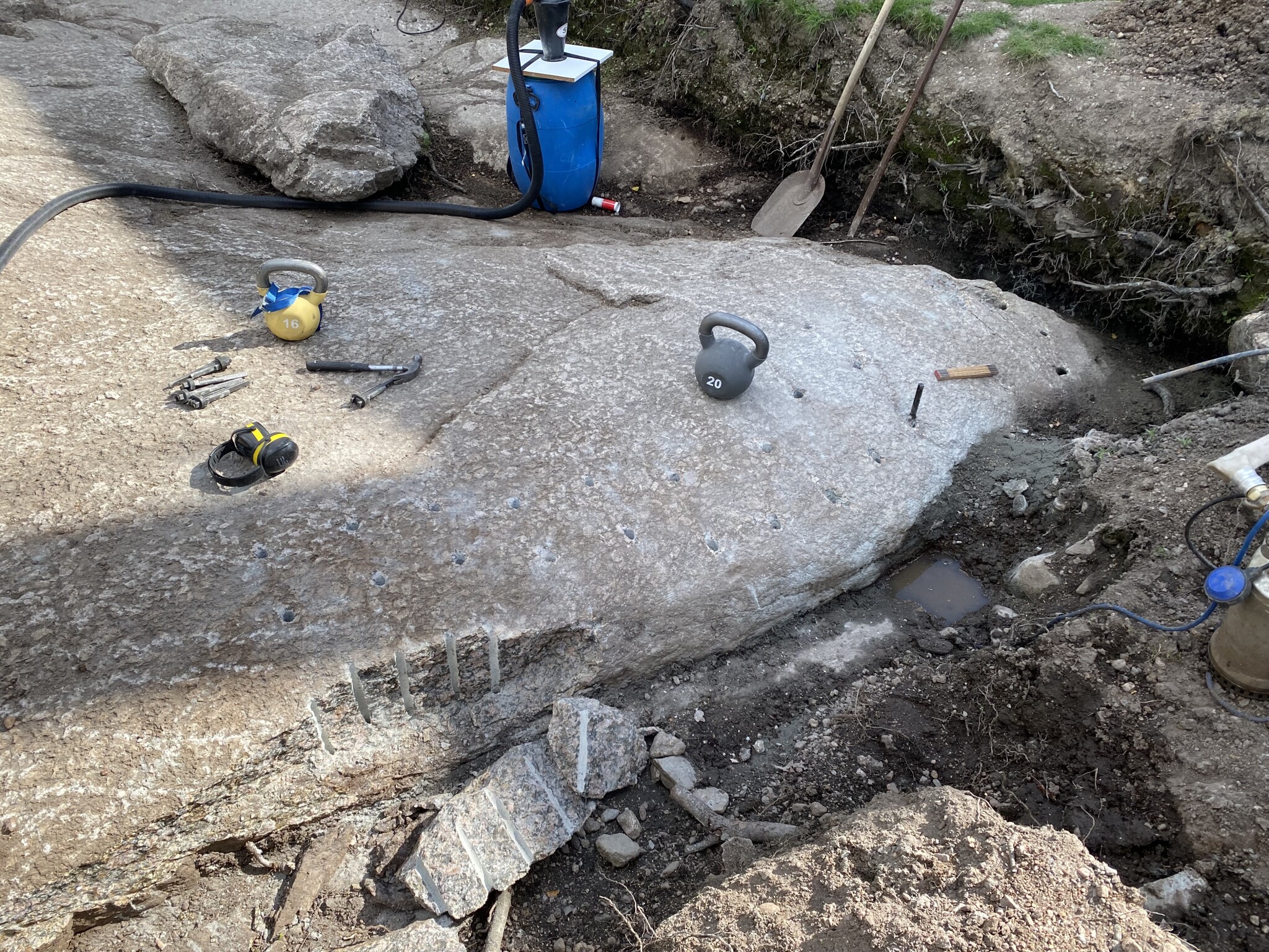 Då var det dags att ge sig på berget. Köpte 20kg snigeldynamit (Dynacem) och 5 st 20mm spräckkilar för att testa vad som händer och lära mig. Precis där vi slutade gräva var det en rak kant på berget som borde vara lämplig att spräcka utefter.