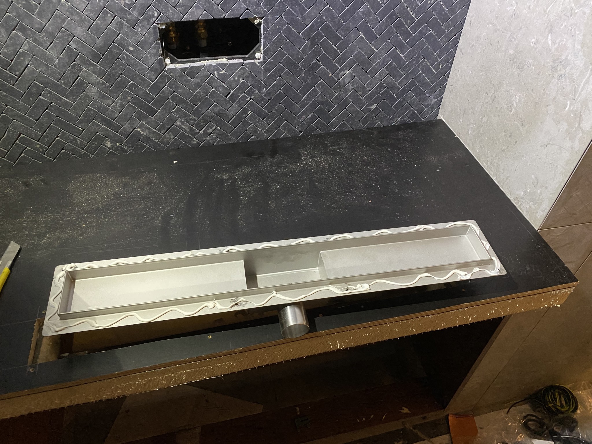 . Man ser också den kil som skapar lutningen ner mot avloppet, alltså dit vattnet ska rinna, men även här kan man göra som man vill! Vill man att vattnet ska rinna mot sig så gör man så.