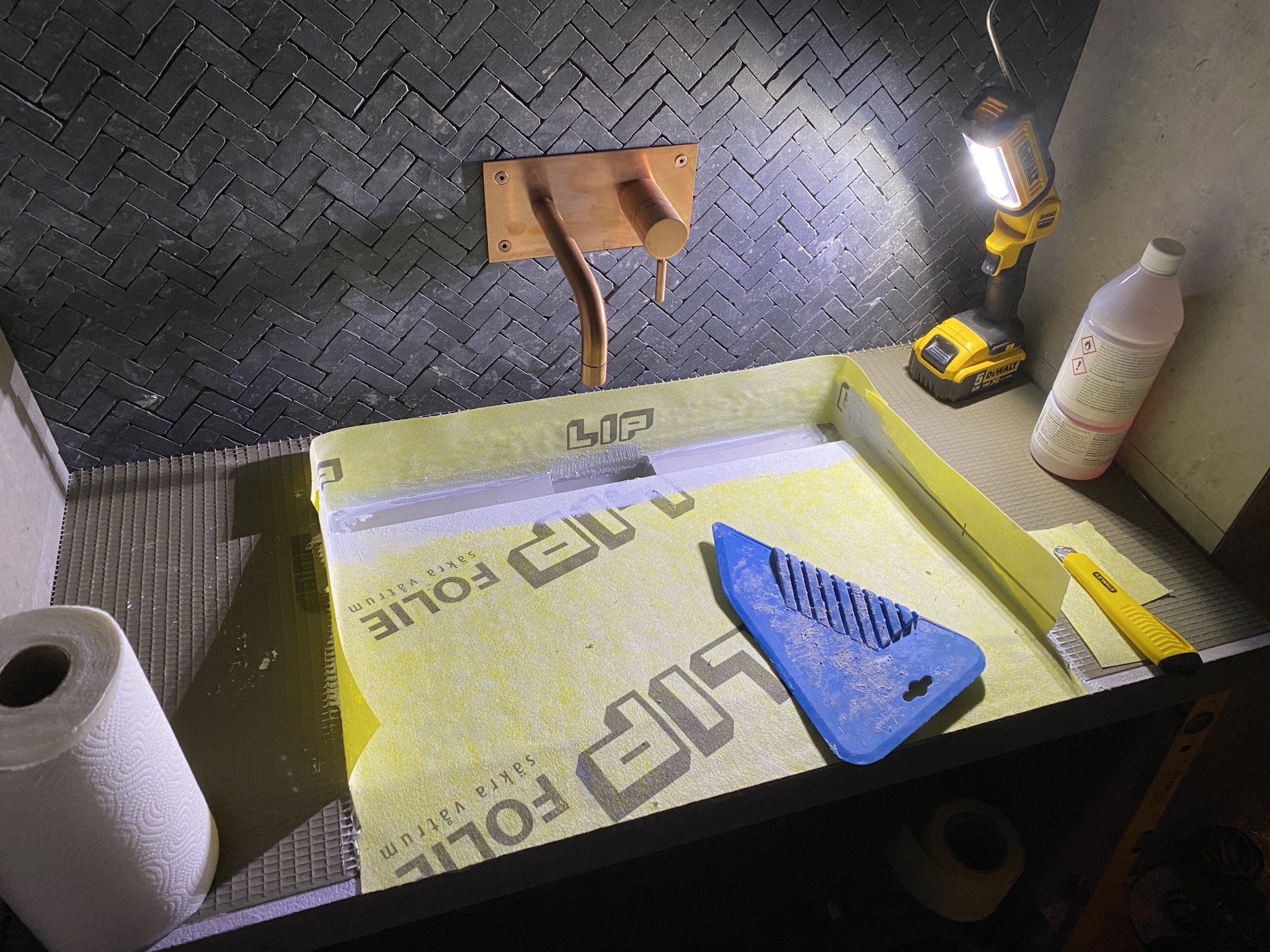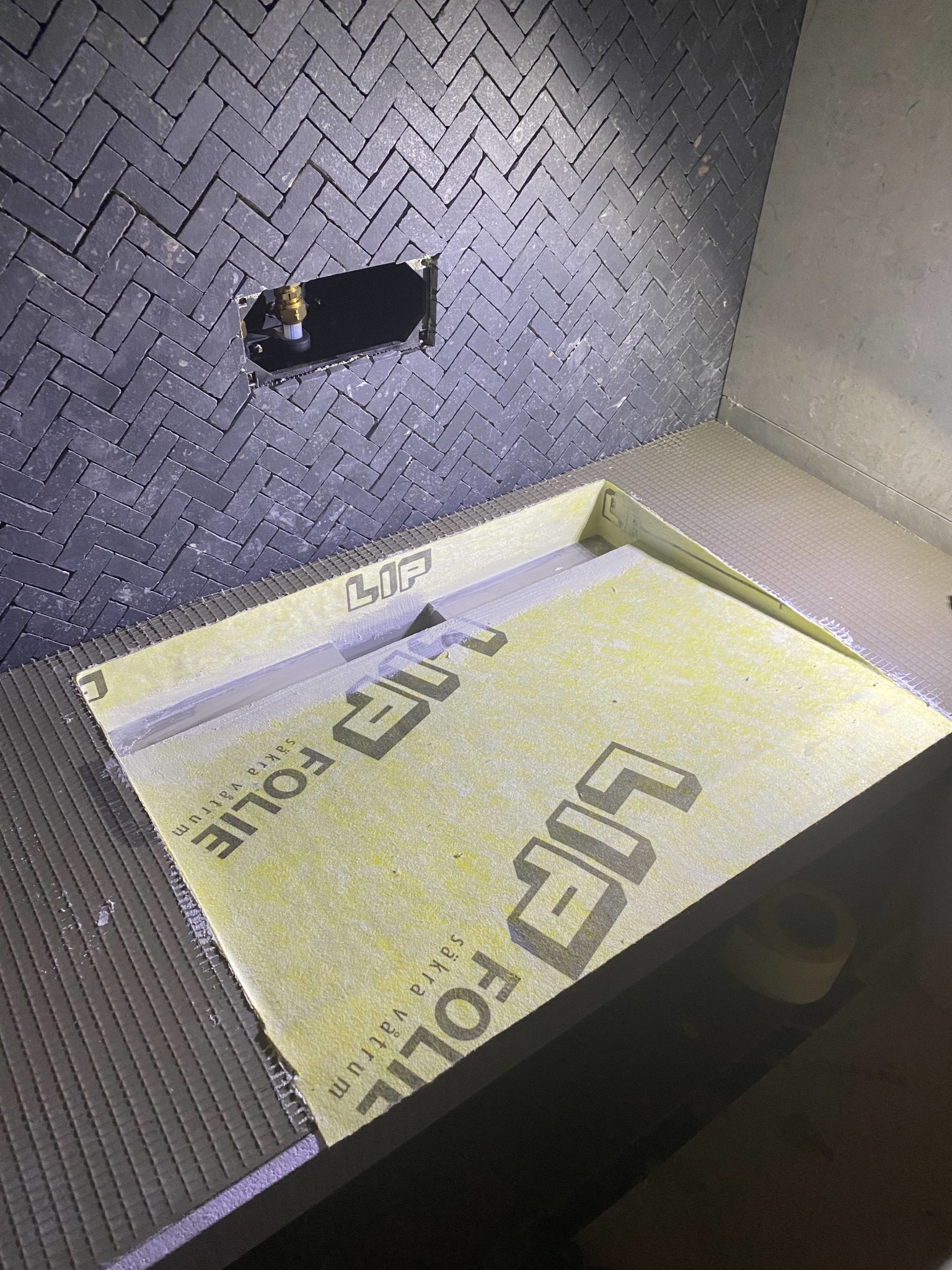 Jag har inte kommit till det ännu, men ja det finns ett tätskikt under. Jag har kört Lip i hela badrummet och det fanns gott om spillbitar kvar att använda. Såhär gjorde jag