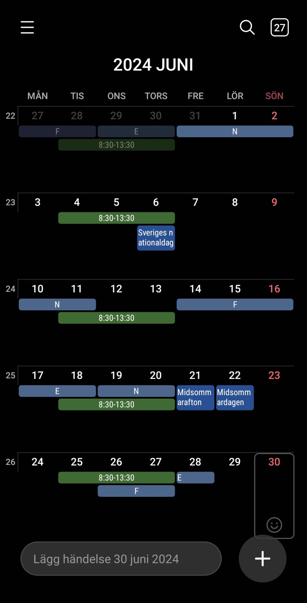 Skulle min käre make glömma att uppdatera sin arbetstid i kalendern får han skylla sig själv att han ska skrapa rutor. Men för att få ihop livet med förskola osv är faktiskt kalendern väl uppdaterad så att även jag som inte kan lära mig skiftgången utantill kan planera framåt i tiden.