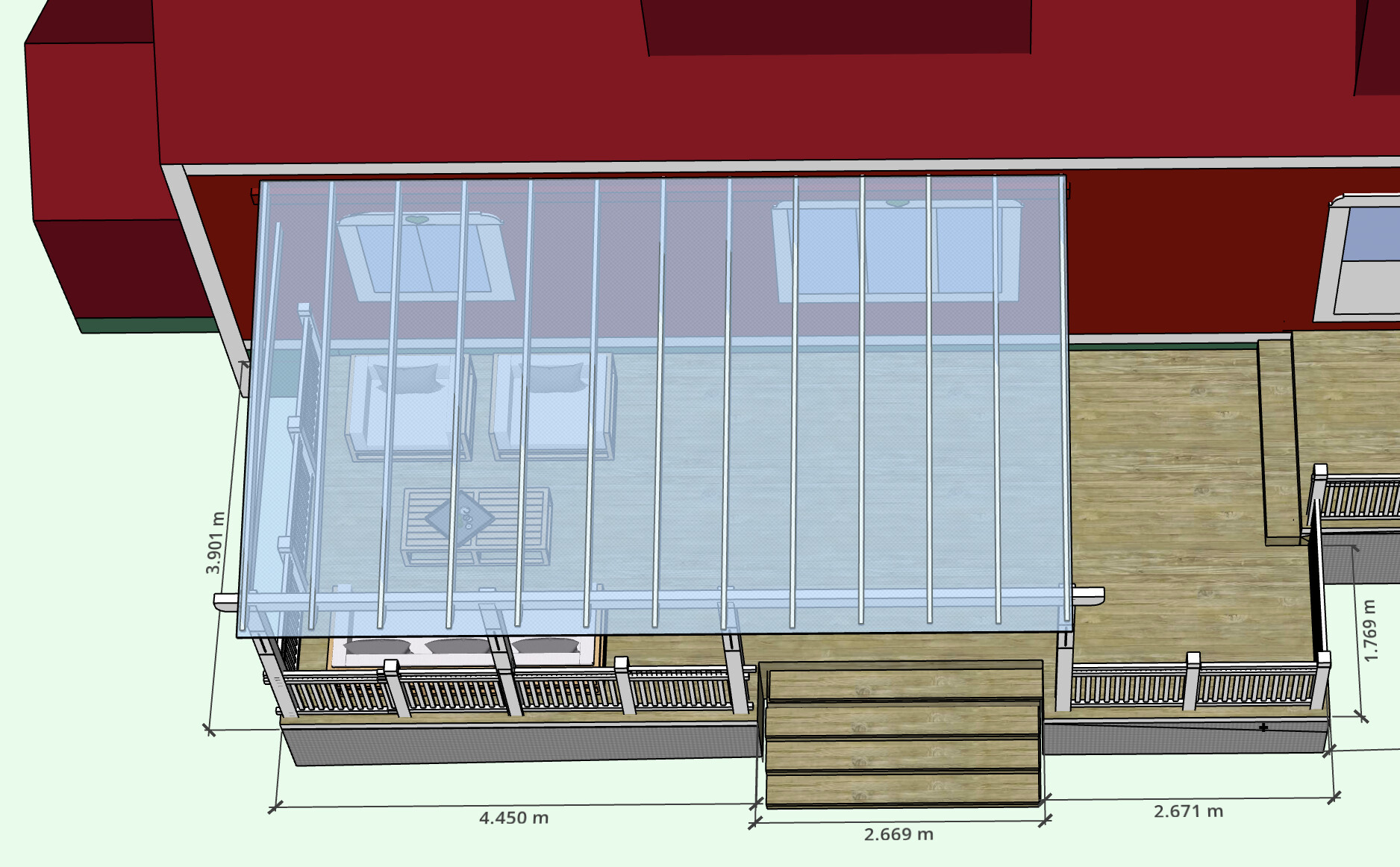 Hade tänkt ha ungefär 4 meters djup på altanen men med tänkt bredd på altanen ger det ett tak på ca 34 kvm. För att komma ner till strax under 30 kvm tak behöver jag dra ner altandjupet till 3.5 kvm vilket känns lite synd.