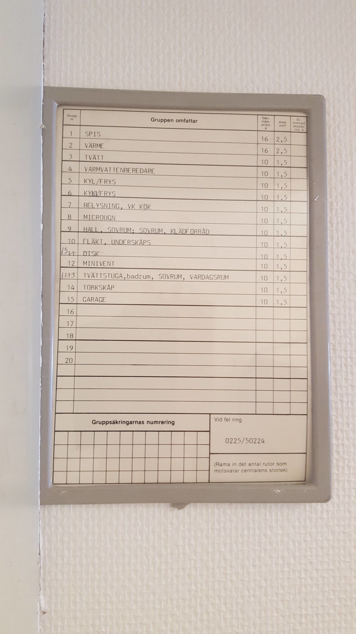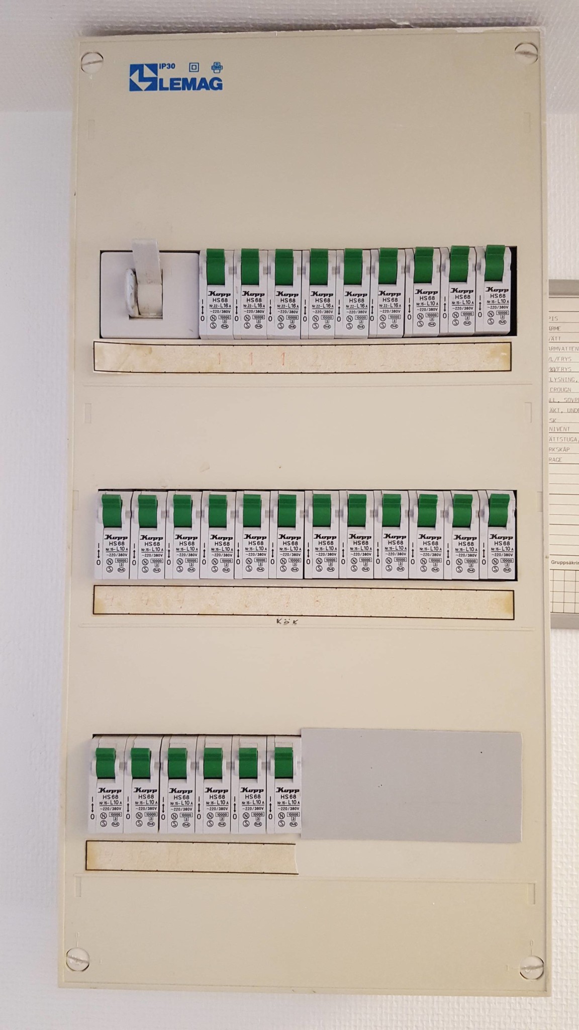Gruppcentralen, är de snabbsäkringarna jag har inne? Vet inte om förteckningen stämmer sen köket gjordes om och siffrorna vid knapparna syns knappt men går att räkna.
