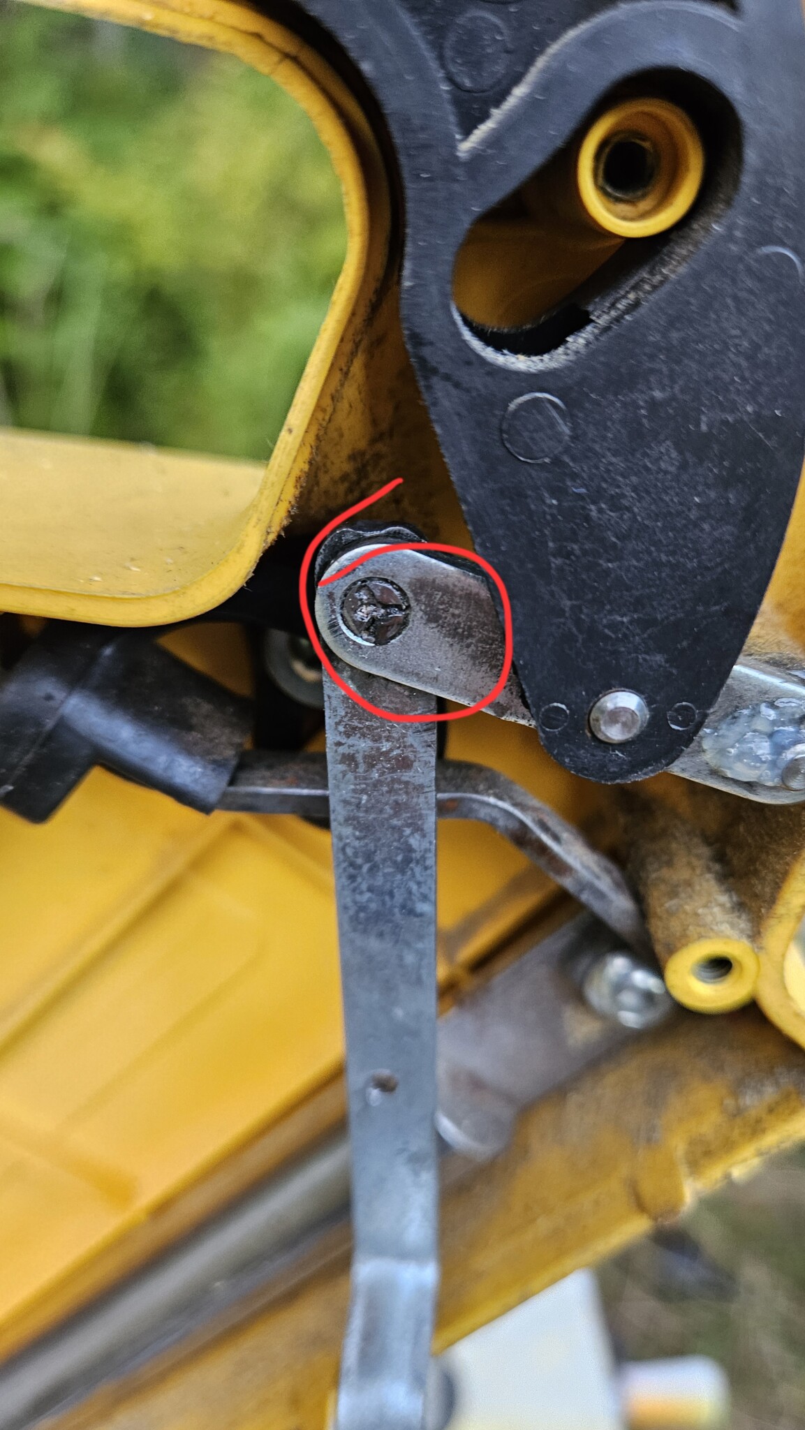 Dagens loppisfynd, en Dewalt girsåg DW707 visade sig inte dra tillbaka skyddet tillräckligt när man tryckte in handtaget. Ett kraftigt glapp i inringad led verkade vara orsaken. Jag tvingade ner en sågad och klippt remsa från en rörnit av mässing i glappet, och stukade ändan med en penhammare. Lite fett på leden och sedan test med lyckat resultat.