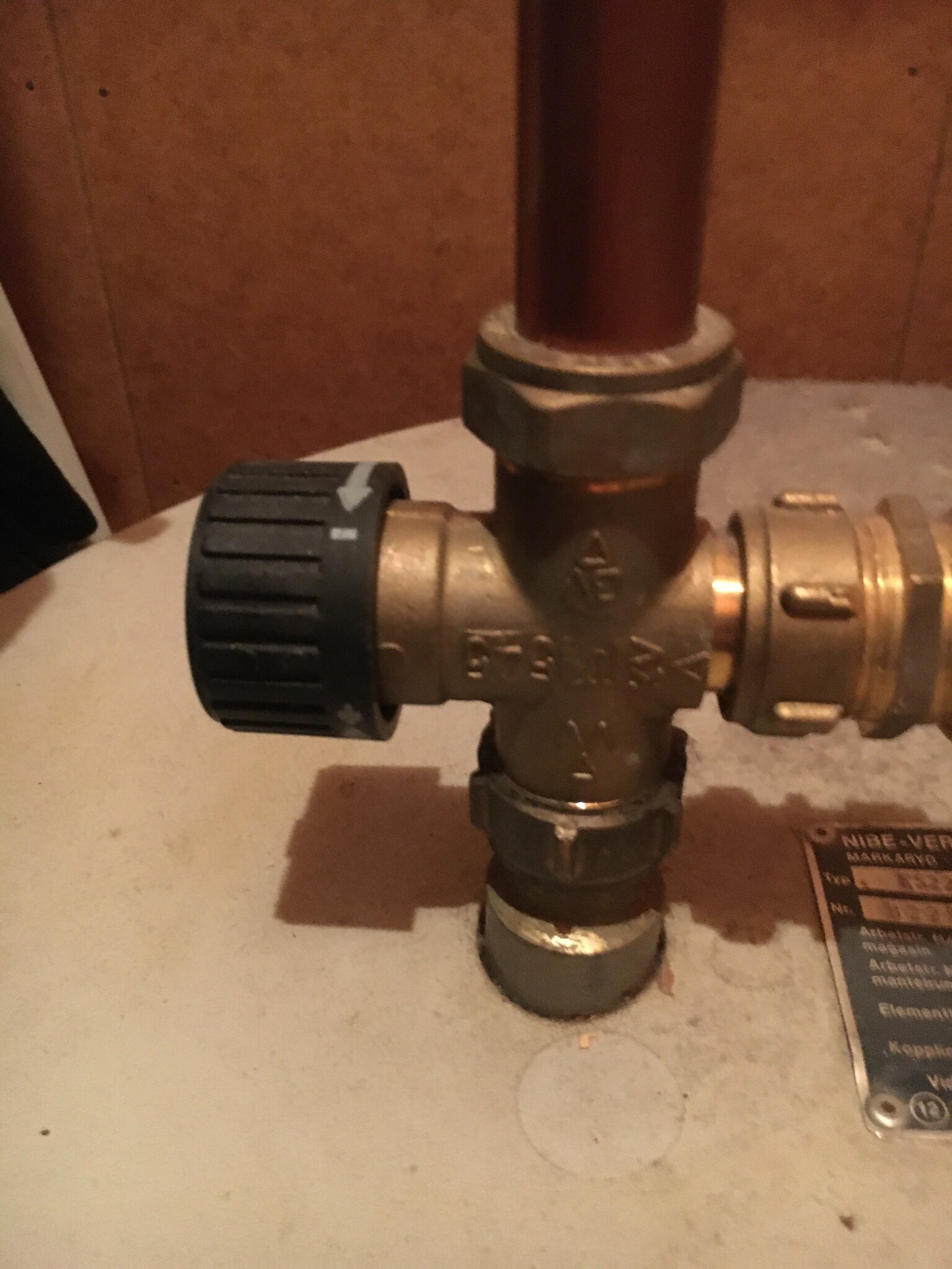Vredet med pilar och plus- och minustecken är blandningsventilen som du kan ställa varmvattnets temperatur med. Det sneda vredet är troligen till säkerhetsventilen. Vart leder den vita PEX-slangen som leder bort från säkerhetsventilen? Och rinner det mycket vatten ur den?H Hjälpnutack skrev: