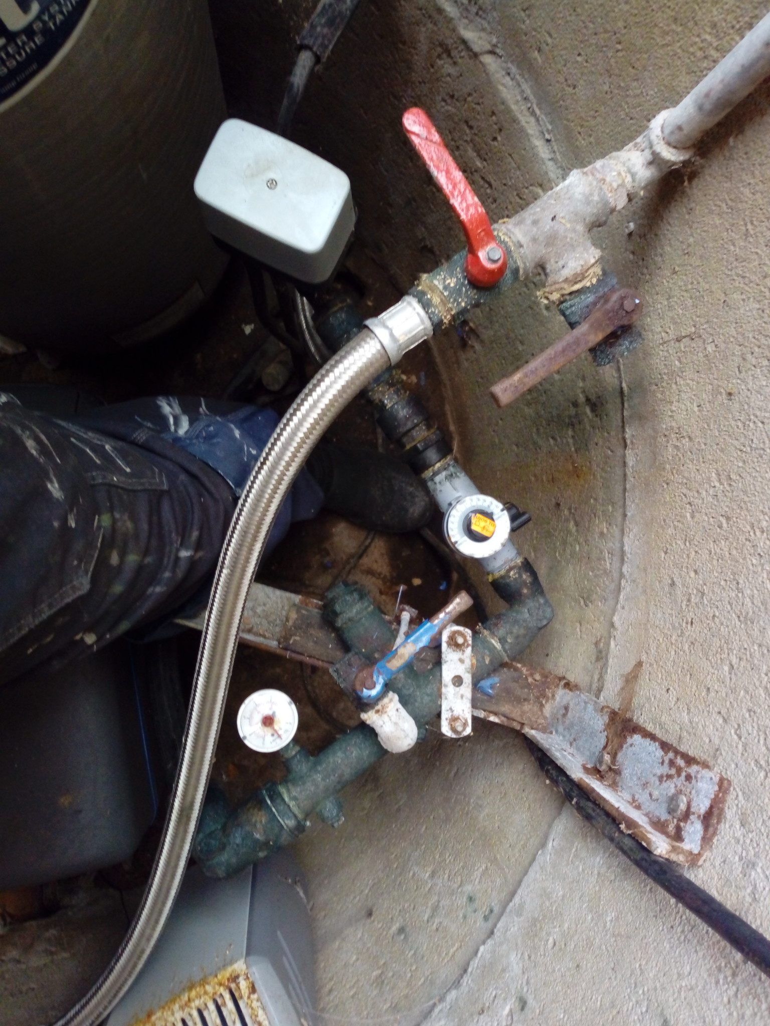 Inkommande vatten kommer från nedre vänstra hörnet, i pem-slang. Passerar manometer, luftinsug och går ned till hydrofor(?) ungefär under den stålflätade slangen. Pumprelät sitter "rakt fram" på röret.