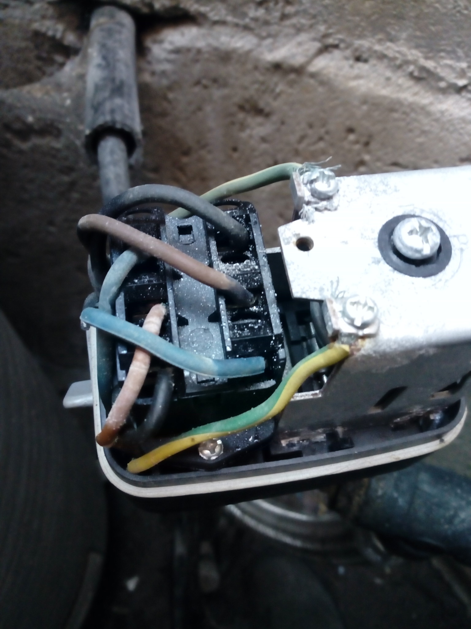 Inkommande el närmast mekaniken, utgående till vänster. 400 V mellan fästena.