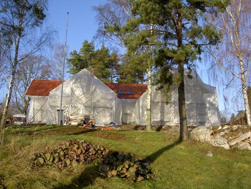 Jag lyckades inte få något riktigt komplett svar av av vare sig STO, entreprenören eller kvalitetsansvarig, men det vi gjorde var att välja att täcka in hela huset och sätta på värme innanför övertäckningen, för att få bra tork, med tanke på hur fuktigt och rått det är så här års.