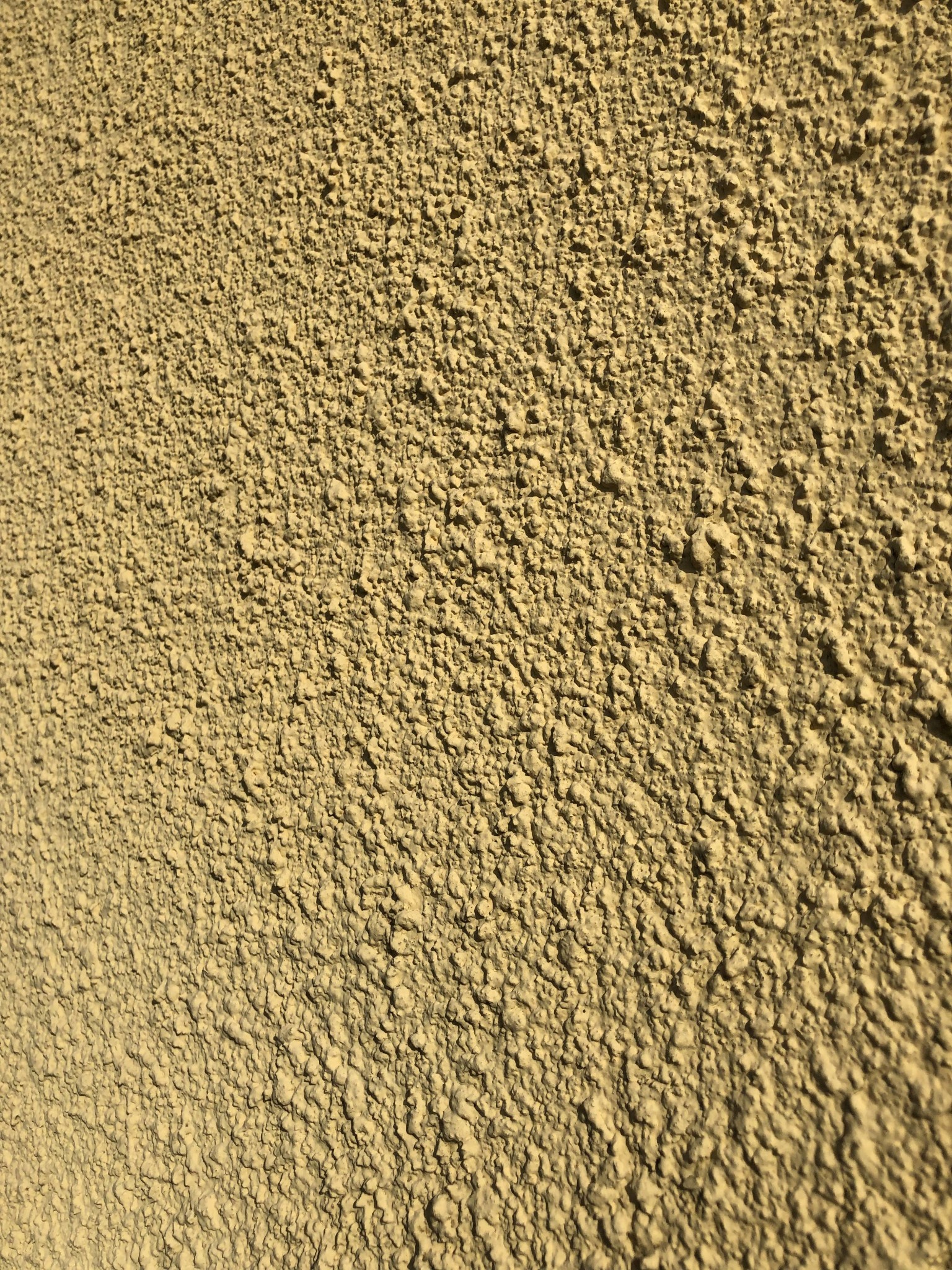 Det förvirrar mig att jag inte får reaktion på flagorna. Eftersom det känns som det är samma färg. Båda färgar av sig ett ljusgult damm på handen när jag gnuggar den mot väggen. Det är mycket lättare mot den släta ytan på den äldre delen än den knottriga stänkputsen, men det ser och känns likadant.