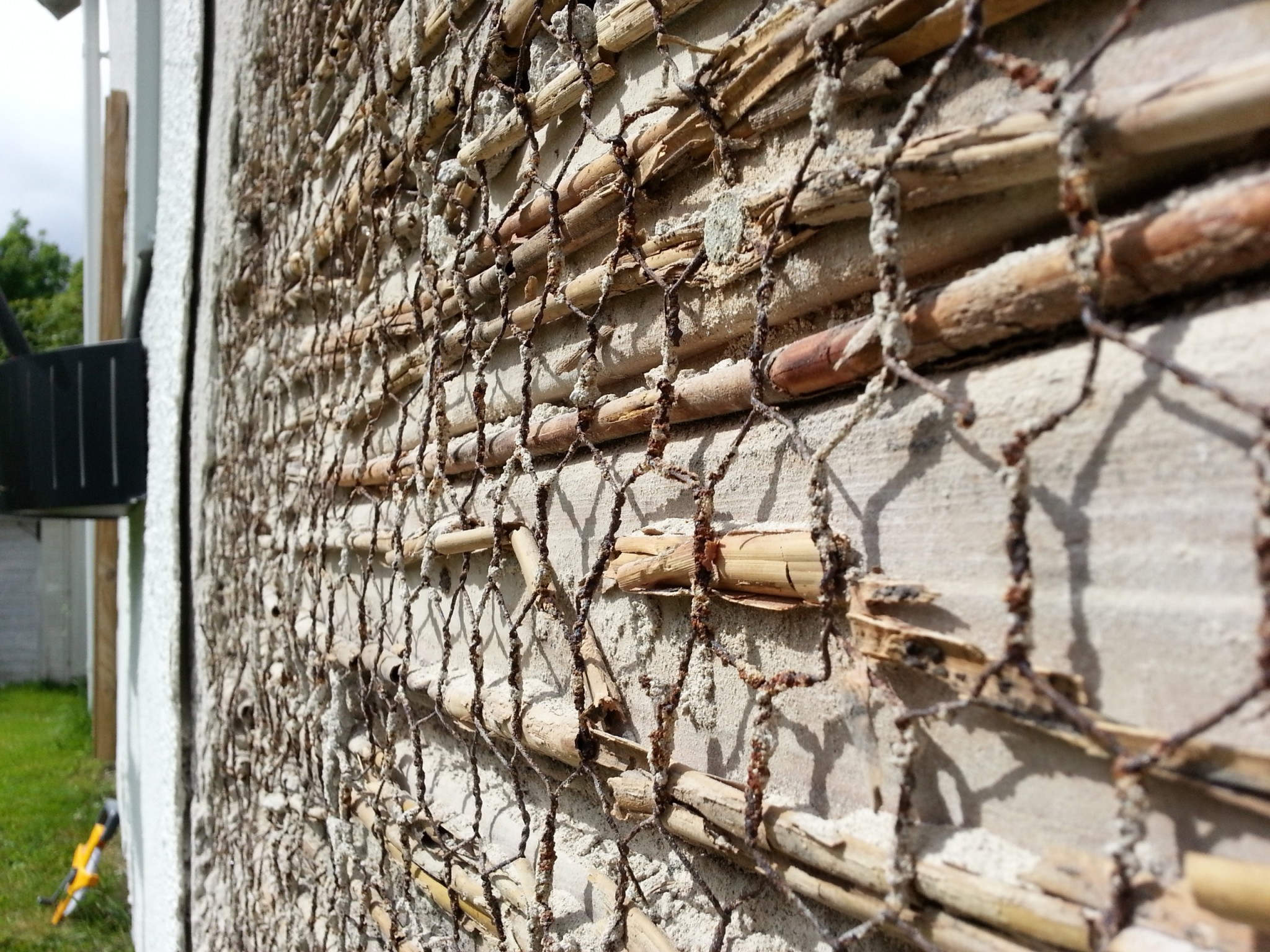 Ytterväggen är uppbyggd av Puts-Hönsnät-Vass/halmmatta.