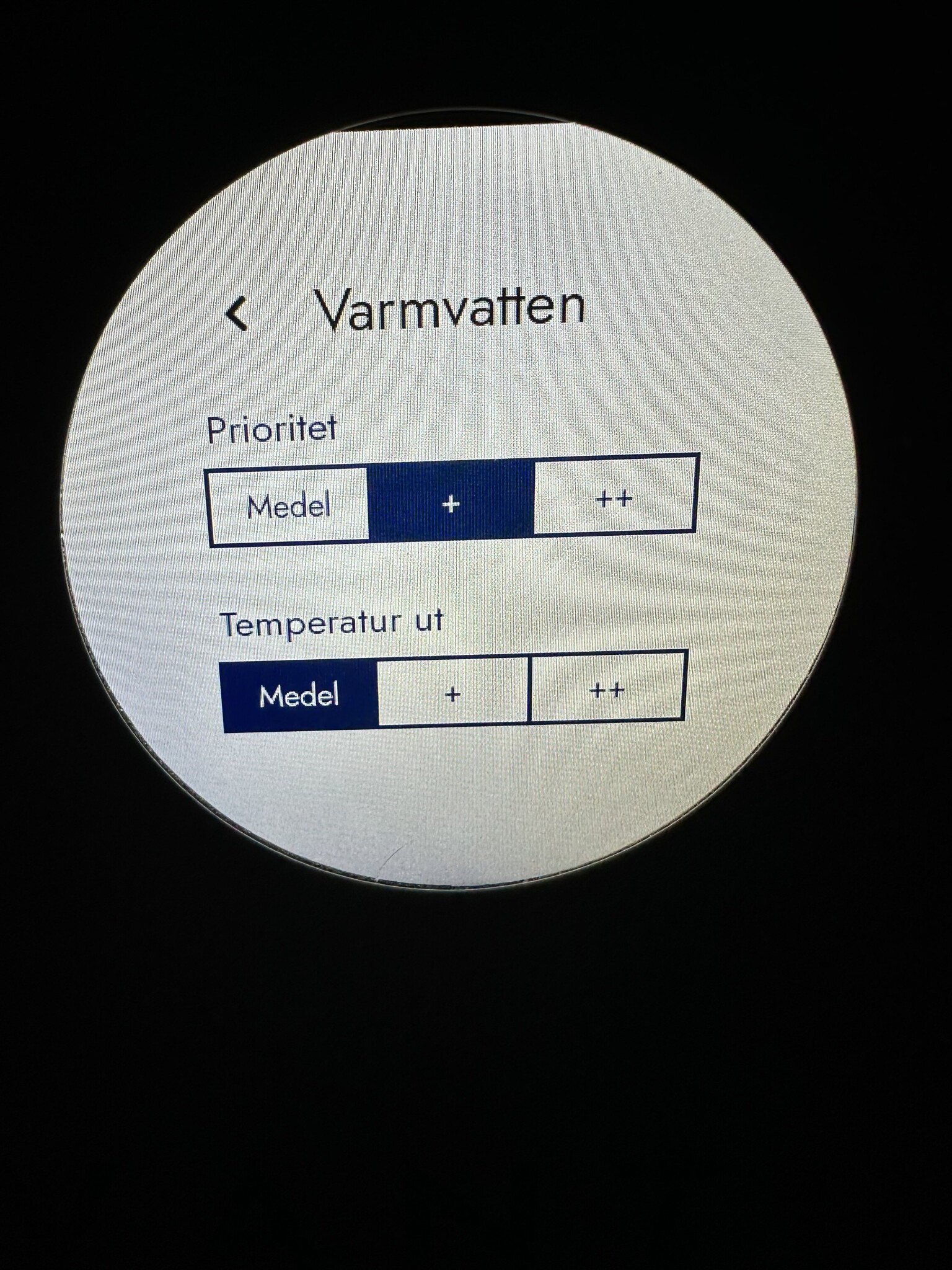 Här kan man ändra utgående varmvattentemperatur medel = 50°, + = 52° och ++ = 56°.