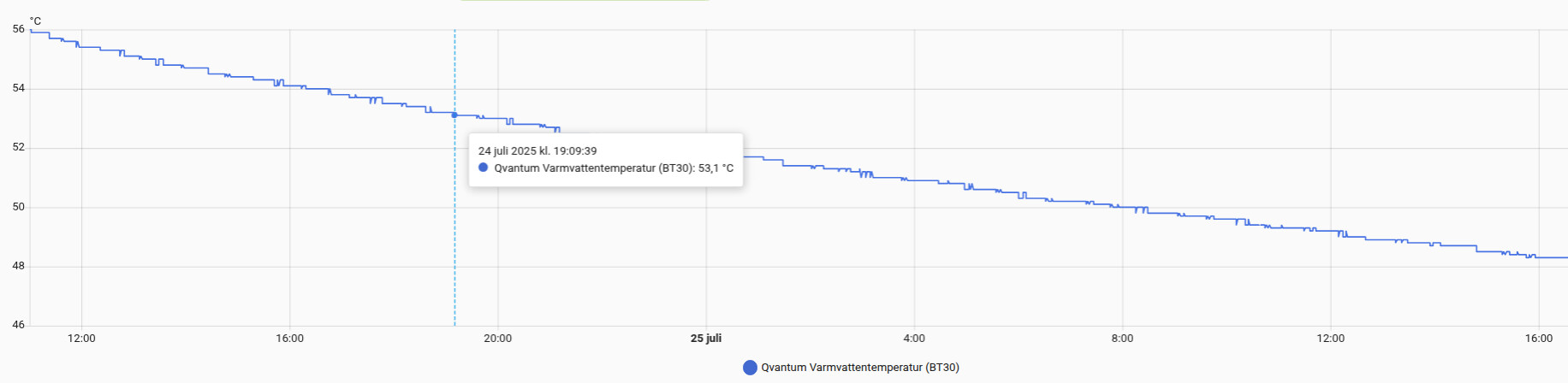 Det senare går ju att se i systemvyn på pumpen (man kan nog inte lite på realtidsdata till 100% i appen). När man sätter på en kran på varmaste så ser man att BF1 (kallvatten-flöde genom värmeväxlaren) går upp. I min pump tar det sedan ca 5-6 sekunder innan BT34 (vattentemp från värmeväxlaren) börjar stiga.. Sen har man ju lagget i slingorna på det.